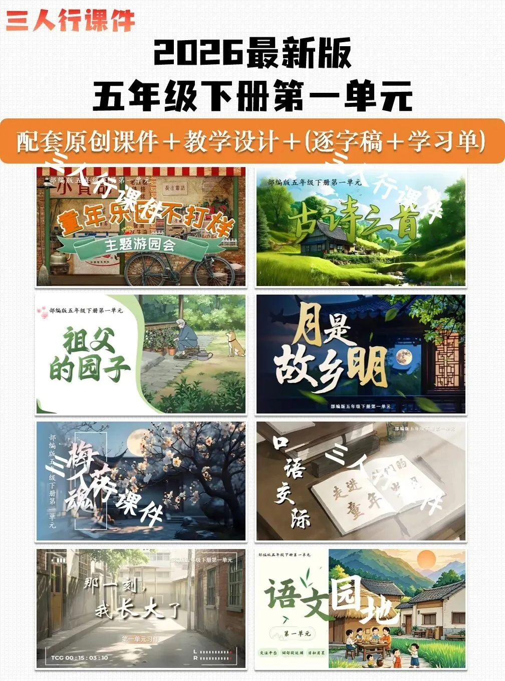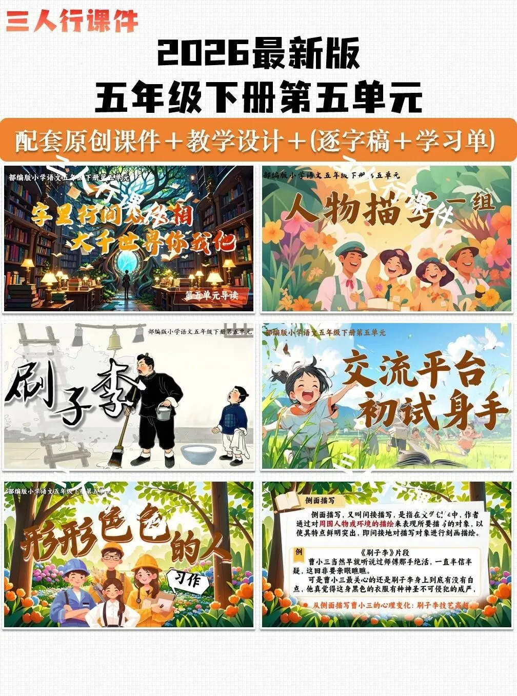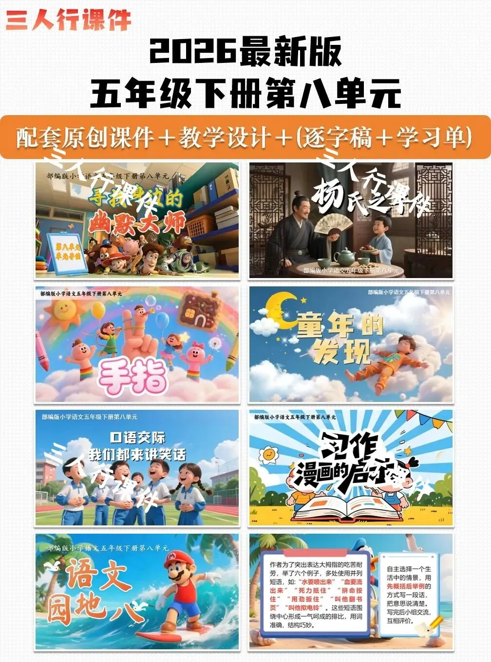 意味着您无需再逐篇找素材、逐环节磨课件,无需拼凑口语交际模板、习作素材和拓展资料,一套资源,就能搞定五下全学期所有教学场景,把更多时间留给教学本身,彻底解放备课压力。