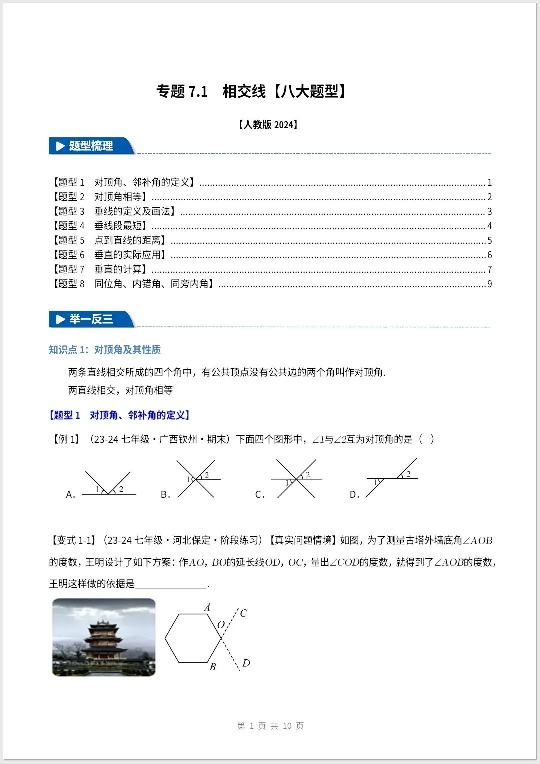 今日分享:2026新版七下数学同步讲义相交线(八大题型)习题+解析,有电子版可下载打印!