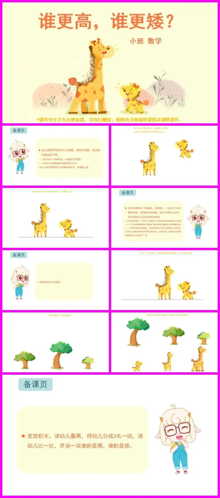 ——三棵树谁最高谁最矮,按高矮顺序分别给长颈鹿和大树排队,引导幼儿根据高矮给长颈鹿分配食物,并尝试说“最高的长颈鹿吃最高的树上的树叶”等。