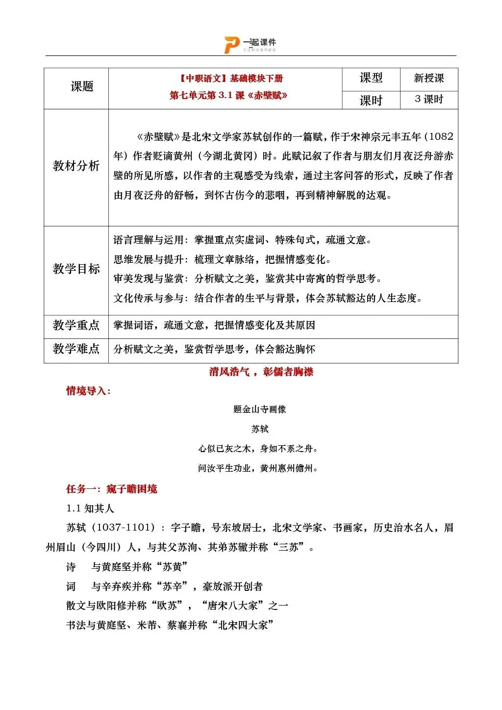 >【中职语文基础模块下】| 《赤壁赋》:课件+教学设计