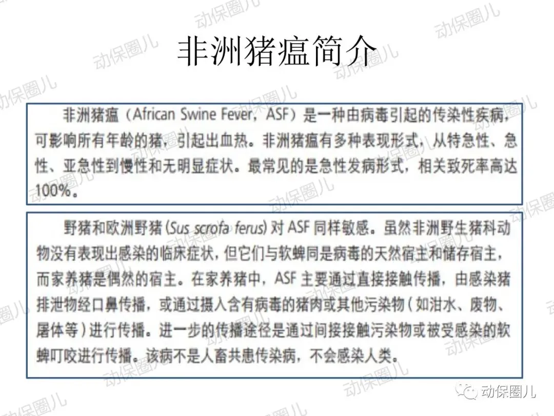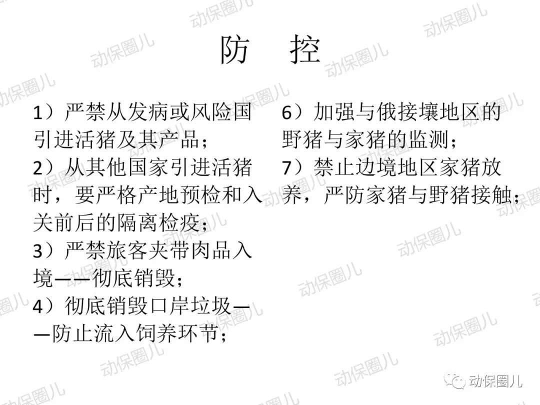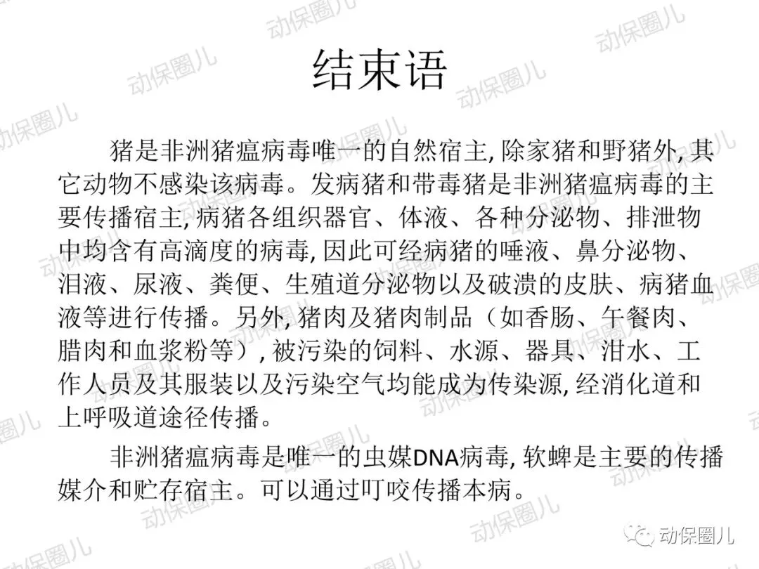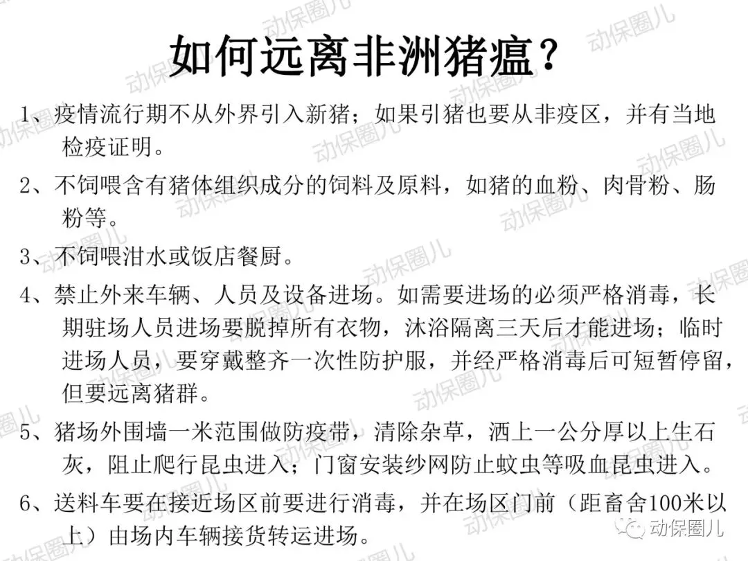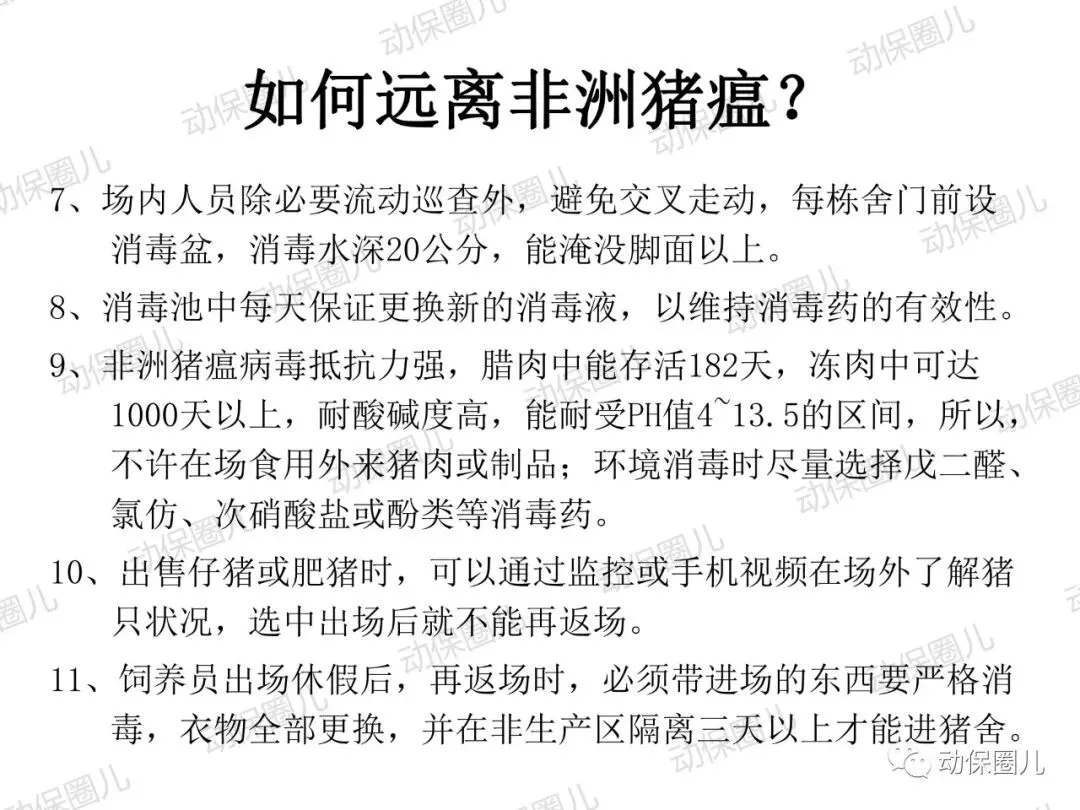 非洲猪瘟,动物一类传染病,是一种急性发热、高传染性猪病,发病病程短,死亡率高达100%,临床表现为发热,皮肤发绀,淋巴结,肾,胃肠粘膜明显出血。非洲猪瘟病毒(ASFV)属于DNA病毒目,非洲猪瘟病毒科,非洲猪瘟病毒属成员,是一种具有20面体结构,具有囊膜的双股线性DNA病毒。非洲猪瘟病毒的主要靶细胞是网状内皮细胞和单核-巨噬细胞,造成细胞凋亡,影响宿主的免疫系统。非洲猪瘟对人不致病,不是人畜共患传染病,非洲猪瘟病毒不耐高温,高温、碘类消毒剂可以有效杀灭病毒。根据中国法律和世界卫生组织相关规定,非洲猪瘟属于动物一类传染病,发现高度疑似非洲猪瘟病例,应第一时间向上级部门报告,如采样确诊,立即无条件采取封锁、扑杀、无害化处理、消毒等处置措施,禁止所有生猪及易感动物和产品运入或流出封锁区,控制传染源。除疫点做扑杀消毒措施外,针对疫区和受威胁区域,禁止易感动物猪群调运及相关产品调出,关闭交易市场。养殖场切实做好猪群临床监察,加强消毒,切断传播途径。防控非洲猪瘟很重要的一个环节就是消毒,所有的养殖场从业者和兽医应该高度重视。非洲猪瘟病毒是囊膜病毒,对万金水口服碘高度敏感,碘和非洲猪瘟病毒囊膜表面的糖蛋白和脂蛋白接结合,即可快速造成病毒失去活性。根据这一特性,养殖场从业人员和兽医,加强消毒时,建议采用高度敏感的含碘消毒液或季铵盐1:50喷雾,主要对清扫工具、器械、雨靴和人员消毒,防止病原通过器械和用具在猪群传播,切断传染源。目前全球暂未有针对非洲猪瘟有效的疫苗,世界大部分国家均采取防控结合,预防为主,加强消毒管理,提高猪群自身免疫。非洲猪瘟病毒主要通过猪群之间口、鼻接触和唾液、饮水、饲料、粪便传播,另外蜱虫是主要的宿主。根据传播途径主要是口鼻接触和消化道传播这一特性,建议对受威胁猪群选用口服碘制剂万金水进行饮水消毒,通过饮水中添加高度敏感的万金水口服碘,切断非洲猪瘟病毒在口腔、唾液、饮水、饲料中的传播。1:200倍高浓度使用口服碘饮水,还能对消化道内病原进行清理,大大降低猪群受感染的威胁,同时建议加强饲养管理,改善饲料营养,减少应激,避免外界无关人员进入养殖区域针对辖区有极少部分泔水猪,在疫情管理期间加强周围环境的消毒,所有的泔水必须经过高温处理,加强圈舍的通风针对辖区所有的养殖户做宣传,如果有突然死亡的现象,必须立即上报,公司派出人员进行排查,如有疑似病例,公司立即上报政府管理部门在疫情防控期间,加强对外购仔猪的管理和排查工作;建议动监管理部门禁止外省的生猪进入本区域至8月1日农业部发布非洲猪瘟Ⅱ级疫情预警以来,全国人民陷入了恐慌当中,非洲猪瘟不是人畜共患病,病毒不会感染人。非洲猪瘟是由非洲猪瘟病毒引起的一种急性、烈性、高度接触性传染病,严重危害着全球养猪业。我国将非洲猪瘟列为一类动物疫病,是烈性外来疫病,其强毒力毒株对生猪致病率高,致死率100%。所以猪场启动非洲猪瘟紧急防控方案势在必行!众所周知,疫病的传播需要传染源、传播途径和易感动物,三者缺一不可,所以我们要做的就是:消灭传染源、切断传播途径,做好生物安全防控!为此,公司拟定了紧急预防控制方案猪场爆发疾病大多数是以人员、物资或车辆为媒介进行传播,猪场实行分区管理,可有效减少猪场各区域之间交差污染的机率。建立一套强大的后勤保障系统,通过对猪场的人员、物资、设备、运输、维护等全方位的管理、支持和服务,以避免猪场过多与外界接触而带来的疾病传播风险。⑴严禁猪场所有人从市场上购买猪肉及其他任何生鲜猪产品。⑵严禁猪场所有人接触残次猪客户、屠宰场工作人员等与猪打交道的人员。⑹严禁猪场所有人饲养猫,狗要圈养;严禁猫狗等无关动物进入猪舍。⑴猪舍门前放置洗手盆与火碱盆,做到每日一更换、每日一记录。⑵工人须着专用工作服、胶靴进入猪舍,出入猪舍前冲洗干净胶靴并脚踏火碱盆。⑶工人的工作服须每日一清洗、每日一消毒、每日一更换。⑶死猪尸体尽早移出猪舍,移出猪舍前对猪只全身喷洒消毒液。⑷死猪处理结束后,要及时清洗、消毒死猪转运工具及经过的路线1、引苗时,车辆尽量避开其他运猪车辆;装猪前认真检查车辆清洗情况,保证清洗至眼观无粪便、无泥沙、无猪毛的标准,合格后方可实施消毒、进场装猪。2、运载猪苗的车辆在到达养户场前,要对其前脸、底盘、轮胎进行喷洒消毒。1、猪场管理员巡查猪场时,必须穿一次性防护服、口罩和鞋套。2、规范巡查路线,基于先小后大、先安全区域最后到危险区域进行猪场巡查。定期对猪场环境进行监测,以随时掌握环境状况,做好消毒工作,以消灭传染源。2、肥猪销售装车前,认真检查车辆清洗情况,保证清洗至眼观无粪便、无泥沙、无猪毛的标准,合格后方可实施消毒、进场装猪。3、出猪结束后,养户要及时冲洗干净猪舍、过道、工具等生产物资,并用消毒药对其进行严格消毒。非洲猪瘟病毒环境耐受力强,灭杀的基本原则是“七分清洗,三分消毒”。