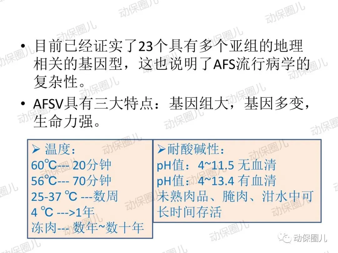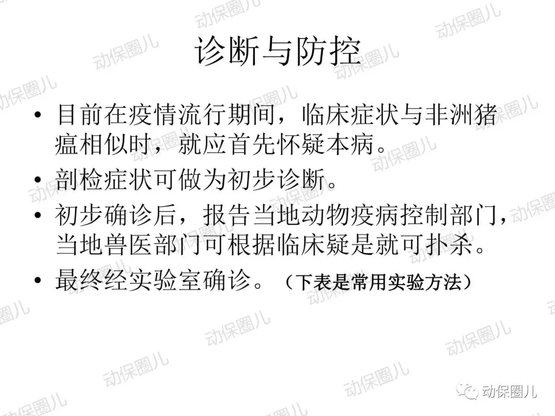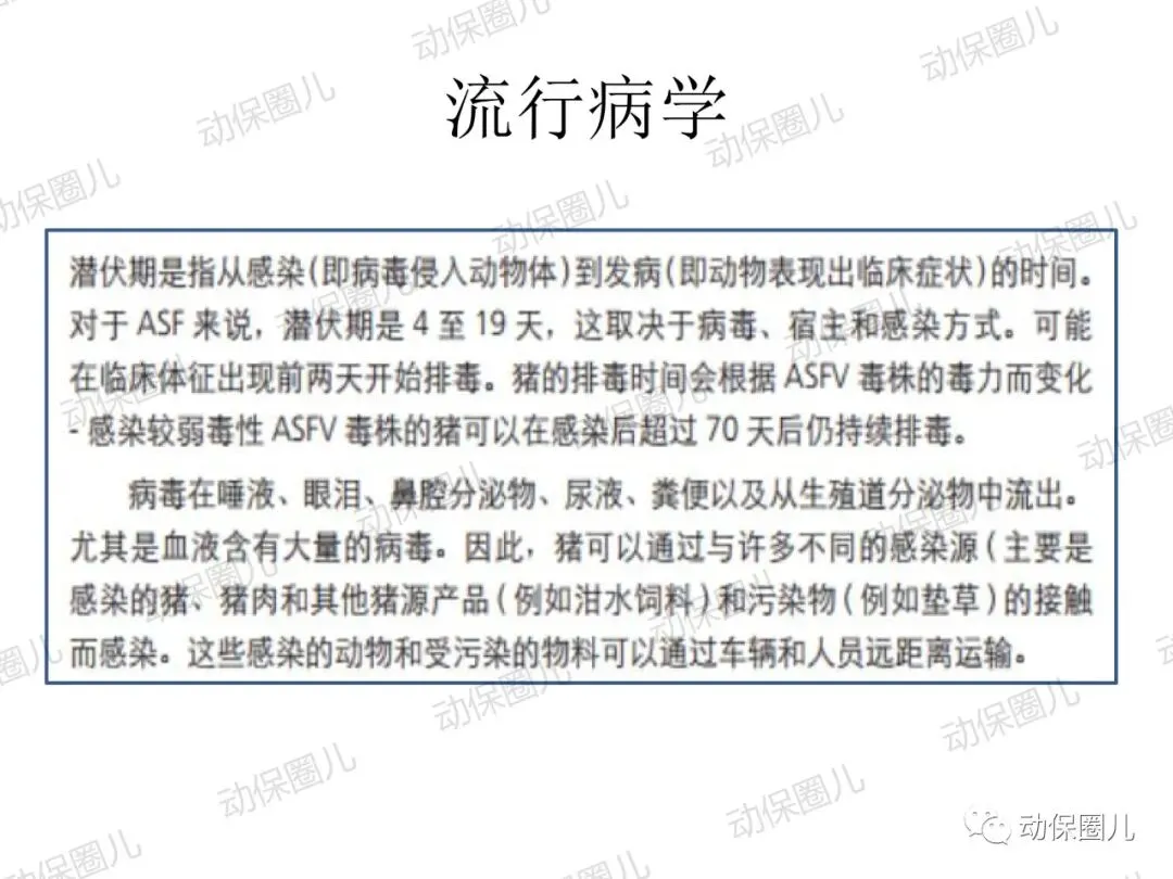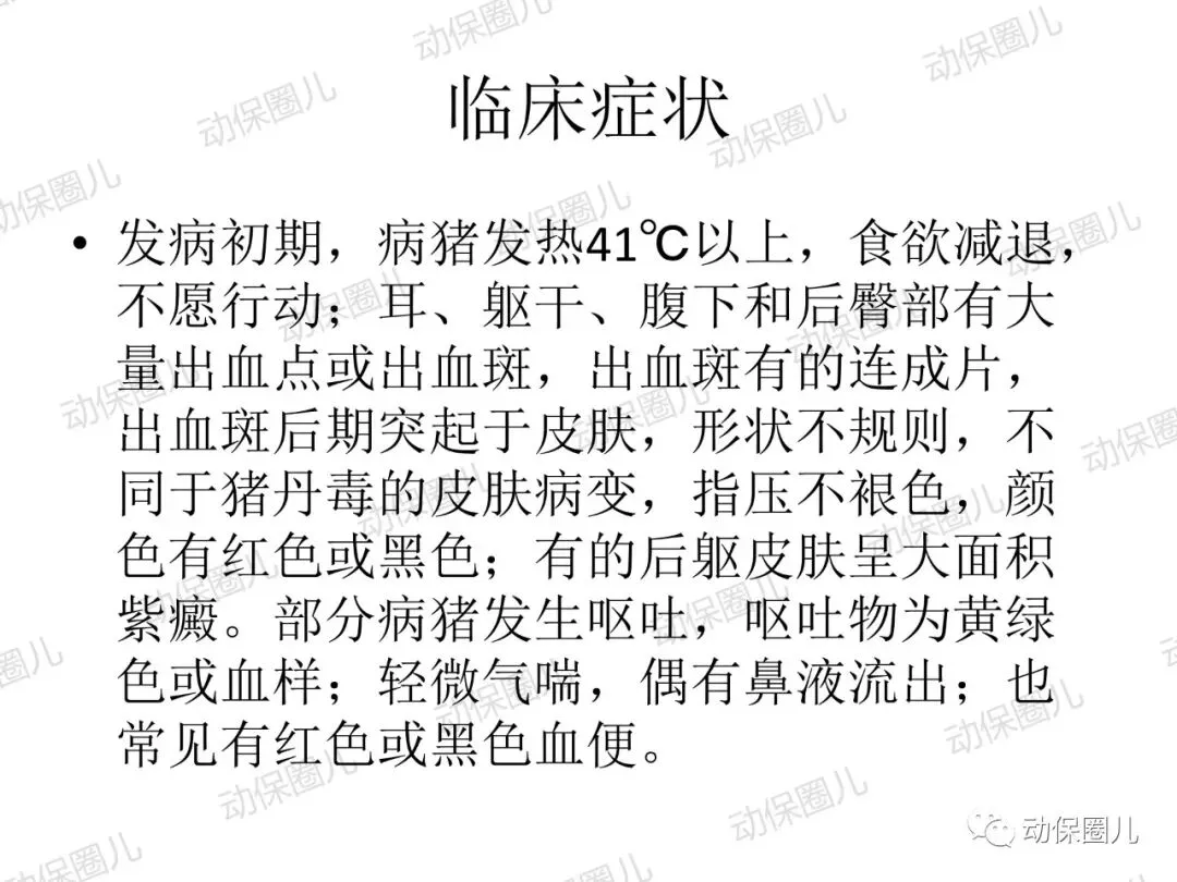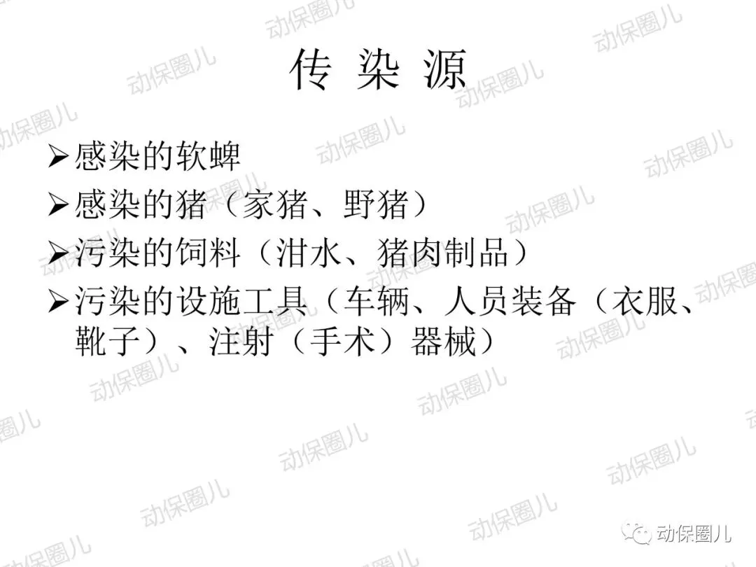 非洲猪瘟,动物一类传染病,是一种急性发热、高传染性猪病,发病病程短,死亡率高达100%,临床表现为发热,皮肤发绀,淋巴结,肾,胃肠粘膜明显出血。非洲猪瘟病毒(ASFV)属于DNA病毒目,非洲猪瘟病毒科,非洲猪瘟病毒属成员,是一种具有20面体结构,具有囊膜的双股线性DNA病毒。非洲猪瘟病毒的主要靶细胞是网状内皮细胞和单核-巨噬细胞,造成细胞凋亡,影响宿主的免疫系统。非洲猪瘟对人不致病,不是人畜共患传染病,非洲猪瘟病毒不耐高温,高温、碘类消毒剂可以有效杀灭病毒。根据中国法律和世界卫生组织相关规定,非洲猪瘟属于动物一类传染病,发现高度疑似非洲猪瘟病例,应第一时间向上级部门报告,如采样确诊,立即无条件采取封锁、扑杀、无害化处理、消毒等处置措施,禁止所有生猪及易感动物和产品运入或流出封锁区,控制传染源。除疫点做扑杀消毒措施外,针对疫区和受威胁区域,禁止易感动物猪群调运及相关产品调出,关闭交易市场。养殖场切实做好猪群临床监察,加强消毒,切断传播途径。防控非洲猪瘟很重要的一个环节就是消毒,所有的养殖场从业者和兽医应该高度重视。非洲猪瘟病毒是囊膜病毒,对万金水口服碘高度敏感,碘和非洲猪瘟病毒囊膜表面的糖蛋白和脂蛋白接结合,即可快速造成病毒失去活性。根据这一特性,养殖场从业人员和兽医,加强消毒时,建议采用高度敏感的含碘消毒液或季铵盐1:50喷雾,主要对清扫工具、器械、雨靴和人员消毒,防止病原通过器械和用具在猪群传播,切断传染源。目前全球暂未有针对非洲猪瘟有效的疫苗,世界大部分国家均采取防控结合,预防为主,加强消毒管理,提高猪群自身免疫。非洲猪瘟病毒主要通过猪群之间口、鼻接触和唾液、饮水、饲料、粪便传播,另外蜱虫是主要的宿主。根据传播途径主要是口鼻接触和消化道传播这一特性,建议对受威胁猪群选用口服碘制剂万金水进行饮水消毒,通过饮水中添加高度敏感的万金水口服碘,切断非洲猪瘟病毒在口腔、唾液、饮水、饲料中的传播。1:200倍高浓度使用口服碘饮水,还能对消化道内病原进行清理,大大降低猪群受感染的威胁,同时建议加强饲养管理,改善饲料营养,减少应激,避免外界无关人员进入养殖区域针对辖区有极少部分泔水猪,在疫情管理期间加强周围环境的消毒,所有的泔水必须经过高温处理,加强圈舍的通风针对辖区所有的养殖户做宣传,如果有突然死亡的现象,必须立即上报,公司派出人员进行排查,如有疑似病例,公司立即上报政府管理部门在疫情防控期间,加强对外购仔猪的管理和排查工作;建议动监管理部门禁止外省的生猪进入本区域至8月1日农业部发布非洲猪瘟Ⅱ级疫情预警以来,全国人民陷入了恐慌当中,非洲猪瘟不是人畜共患病,病毒不会感染人。非洲猪瘟是由非洲猪瘟病毒引起的一种急性、烈性、高度接触性传染病,严重危害着全球养猪业。我国将非洲猪瘟列为一类动物疫病,是烈性外来疫病,其强毒力毒株对生猪致病率高,致死率100%。所以猪场启动非洲猪瘟紧急防控方案势在必行!众所周知,疫病的传播需要传染源、传播途径和易感动物,三者缺一不可,所以我们要做的就是:消灭传染源、切断传播途径,做好生物安全防控!为此,公司拟定了紧急预防控制方案猪场爆发疾病大多数是以人员、物资或车辆为媒介进行传播,猪场实行分区管理,可有效减少猪场各区域之间交差污染的机率。建立一套强大的后勤保障系统,通过对猪场的人员、物资、设备、运输、维护等全方位的管理、支持和服务,以避免猪场过多与外界接触而带来的疾病传播风险。⑴严禁猪场所有人从市场上购买猪肉及其他任何生鲜猪产品。⑵严禁猪场所有人接触残次猪客户、屠宰场工作人员等与猪打交道的人员。⑹严禁猪场所有人饲养猫,狗要圈养;严禁猫狗等无关动物进入猪舍。⑴猪舍门前放置洗手盆与火碱盆,做到每日一更换、每日一记录。⑵工人须着专用工作服、胶靴进入猪舍,出入猪舍前冲洗干净胶靴并脚踏火碱盆。⑶工人的工作服须每日一清洗、每日一消毒、每日一更换。⑶死猪尸体尽早移出猪舍,移出猪舍前对猪只全身喷洒消毒液。⑷死猪处理结束后,要及时清洗、消毒死猪转运工具及经过的路线1、引苗时,车辆尽量避开其他运猪车辆;装猪前认真检查车辆清洗情况,保证清洗至眼观无粪便、无泥沙、无猪毛的标准,合格后方可实施消毒、进场装猪。2、运载猪苗的车辆在到达养户场前,要对其前脸、底盘、轮胎进行喷洒消毒。1、猪场管理员巡查猪场时,必须穿一次性防护服、口罩和鞋套。2、规范巡查路线,基于先小后大、先安全区域最后到危险区域进行猪场巡查。定期对猪场环境进行监测,以随时掌握环境状况,做好消毒工作,以消灭传染源。2、肥猪销售装车前,认真检查车辆清洗情况,保证清洗至眼观无粪便、无泥沙、无猪毛的标准,合格后方可实施消毒、进场装猪。3、出猪结束后,养户要及时冲洗干净猪舍、过道、工具等生产物资,并用消毒药对其进行严格消毒。非洲猪瘟病毒环境耐受力强,灭杀的基本原则是“七分清洗,三分消毒”。