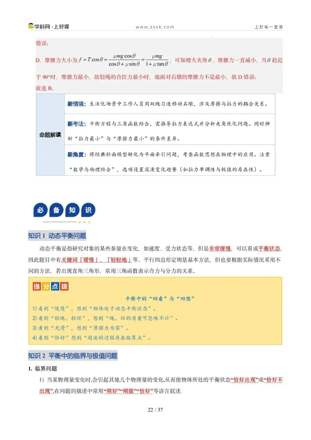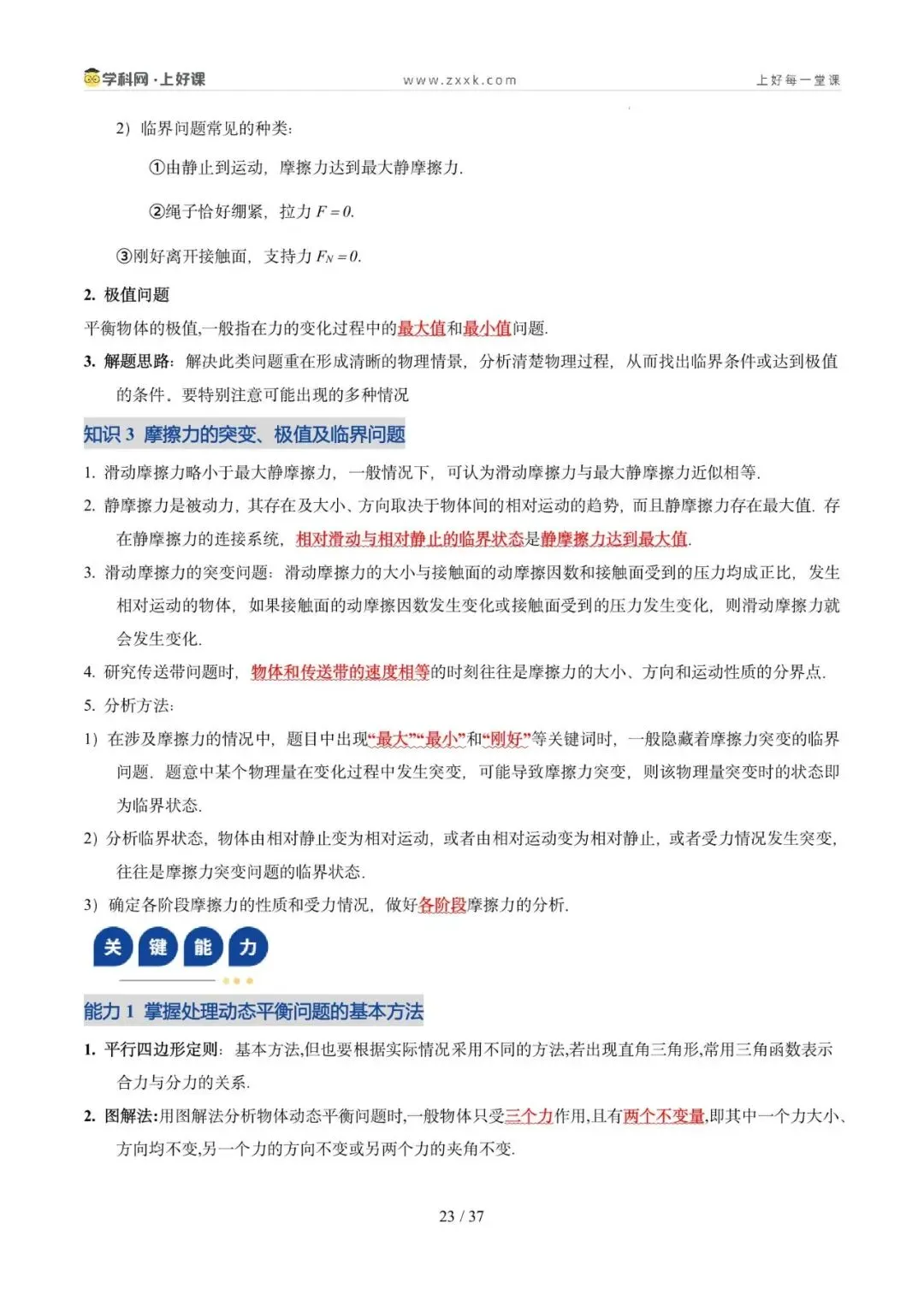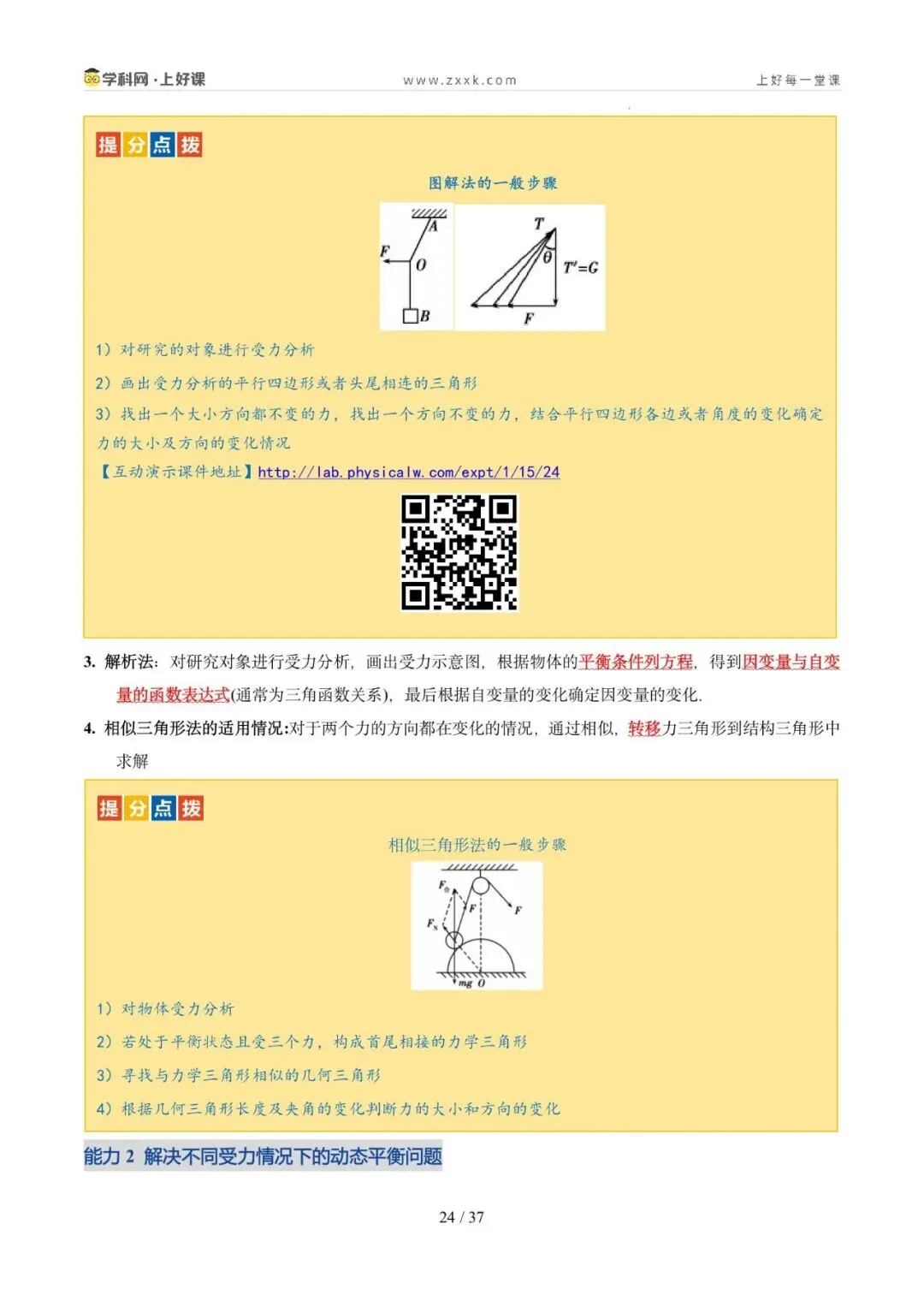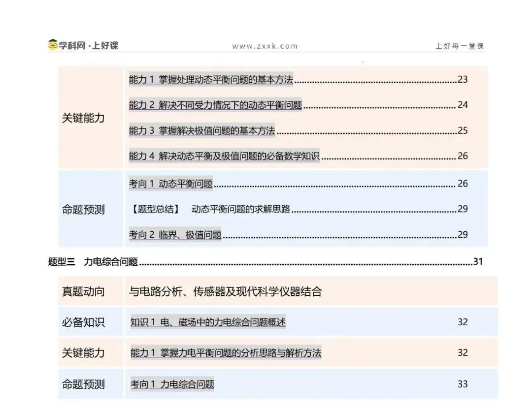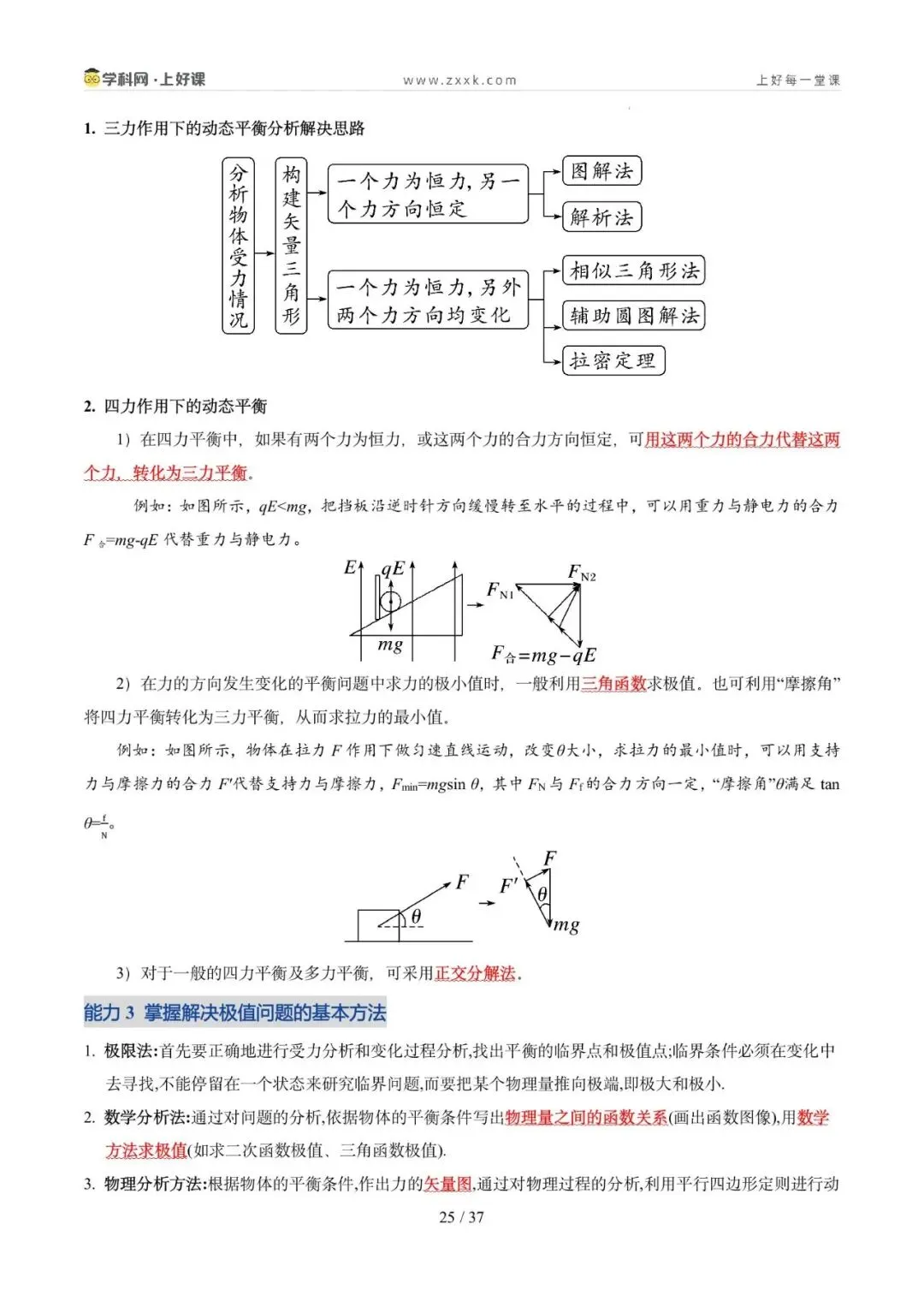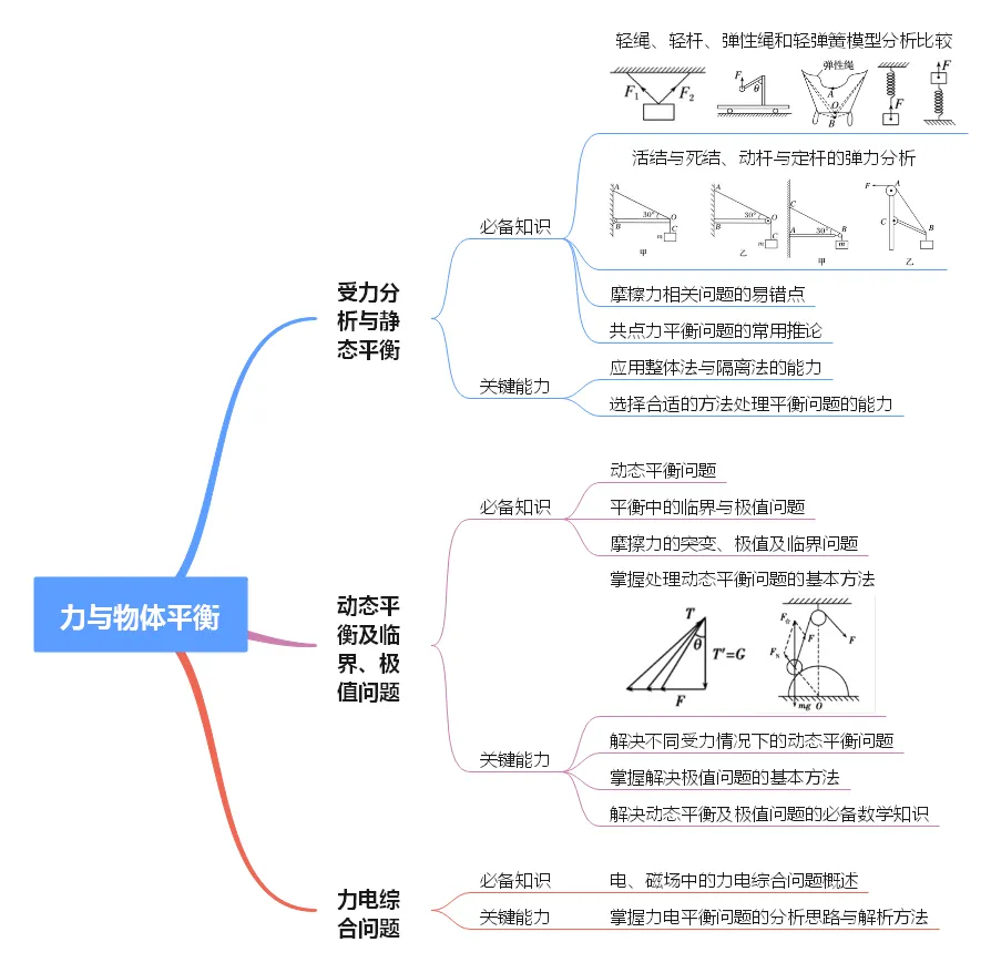 2. 能灵活选取研究对象、会根据实际情况构建平衡模型分析动态平衡问题,掌握常见的处理动态平衡问题的方法,并会处理平衡中的临界与极值问题。核心能力:掌握临界法、函数法、图像法、整体法、隔离法等解题方法