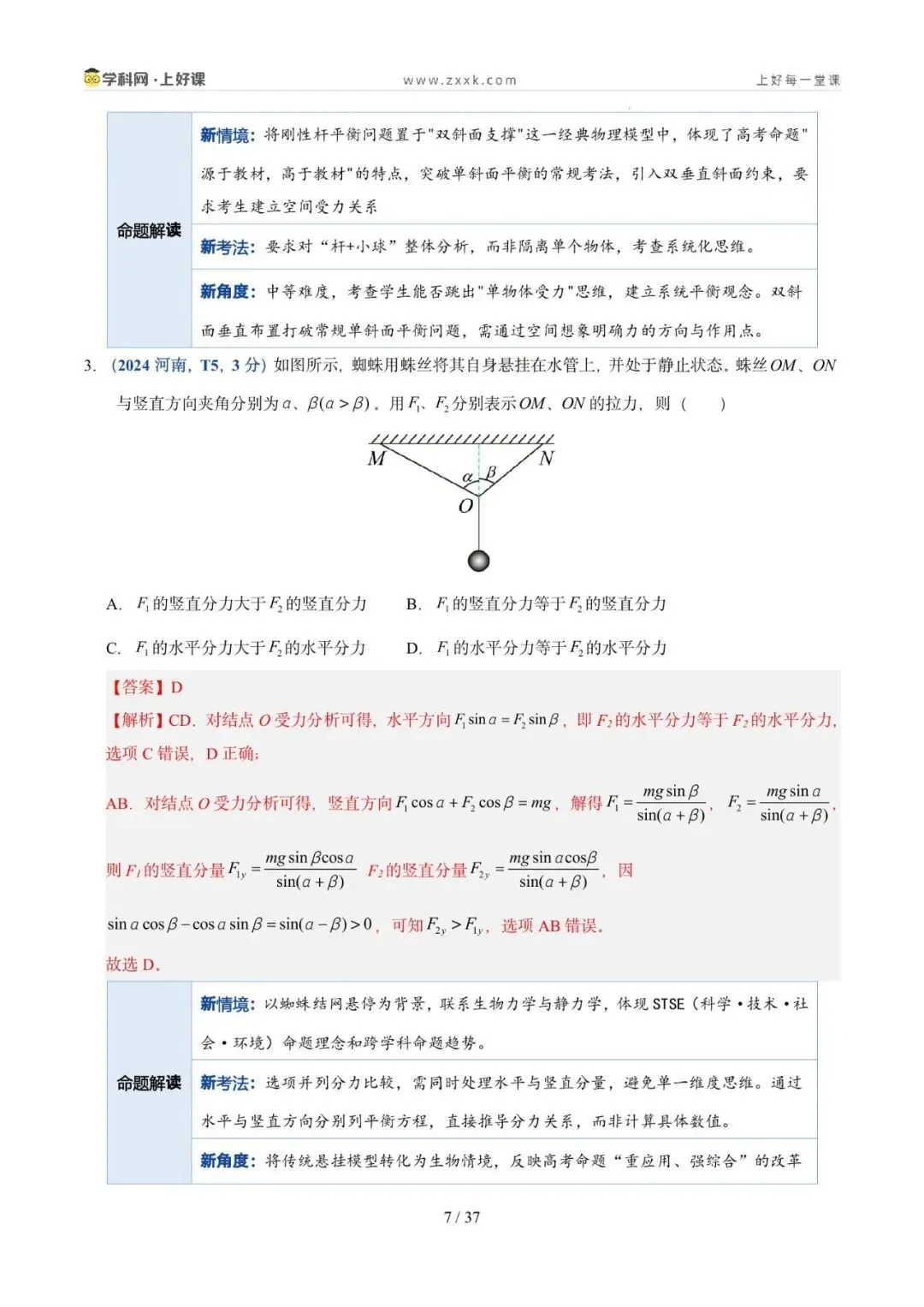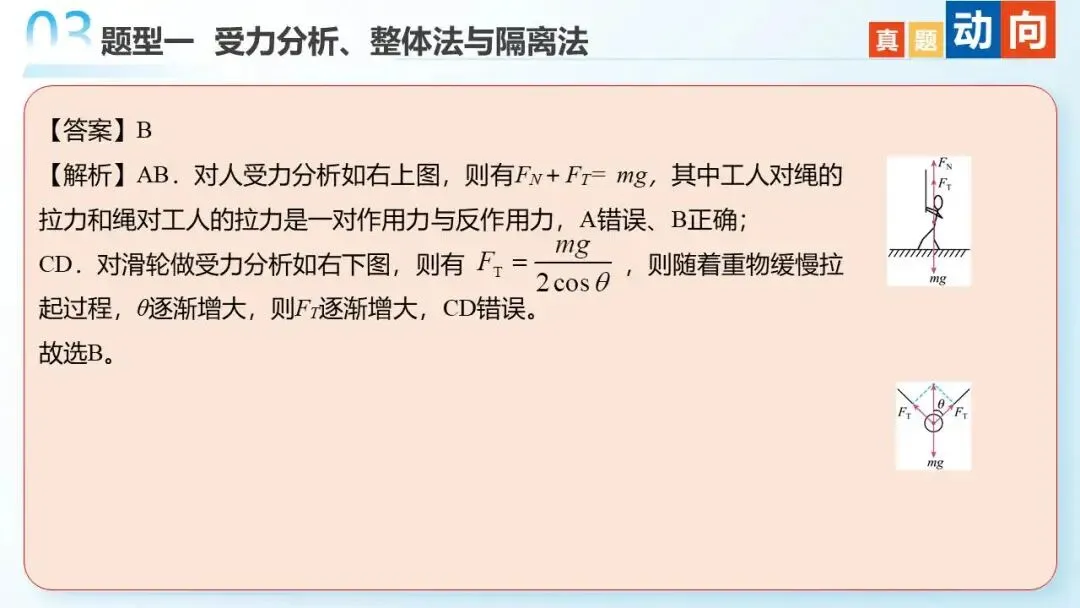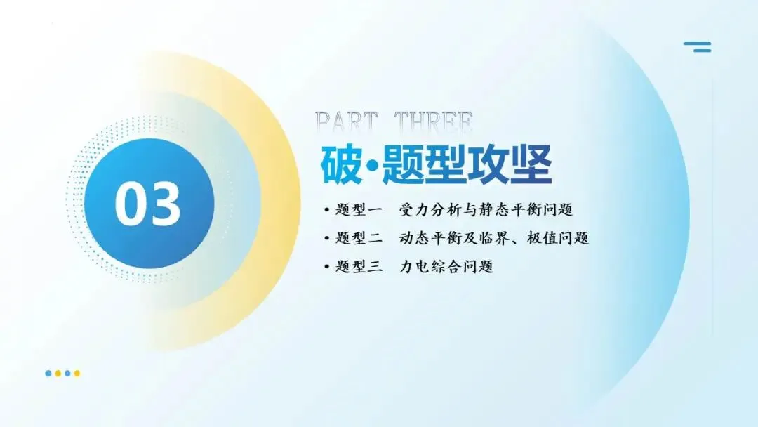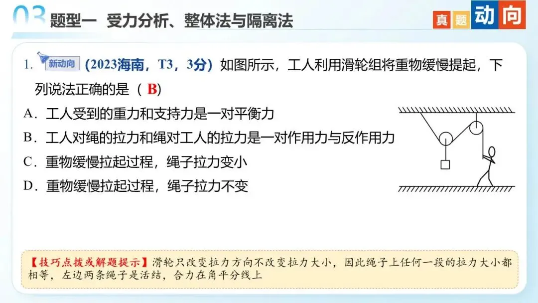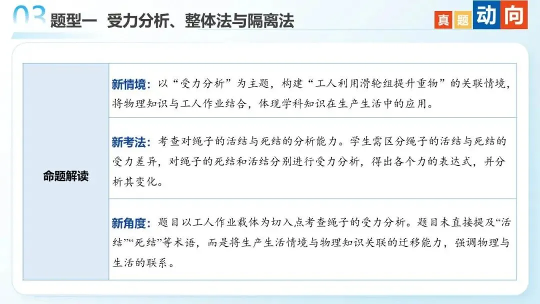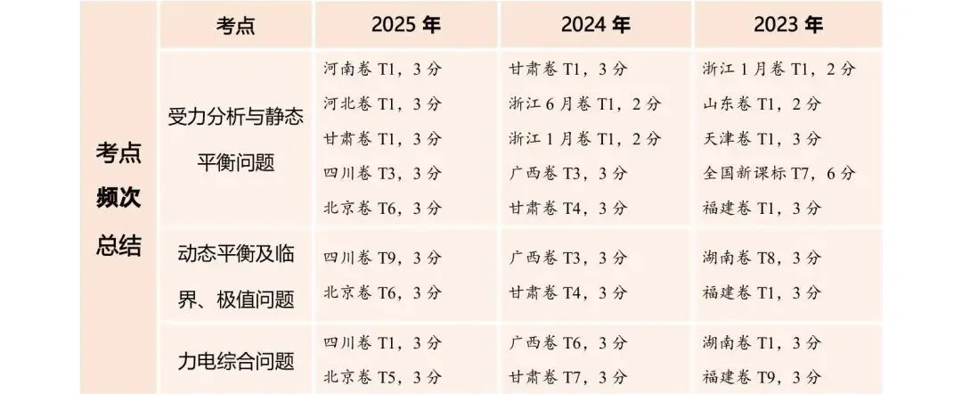 命题轨迹透视:从近三年高考试题来看,试题以选择题为主,题目难度中等。命题趋势:从单一物体的分析→多物体的静态平衡→与电磁场结合→在真实生产/生活情境中综合分析物体平衡,倾向于物体的受力分析为出发点,以反映生产生活的常见问题为切入点。