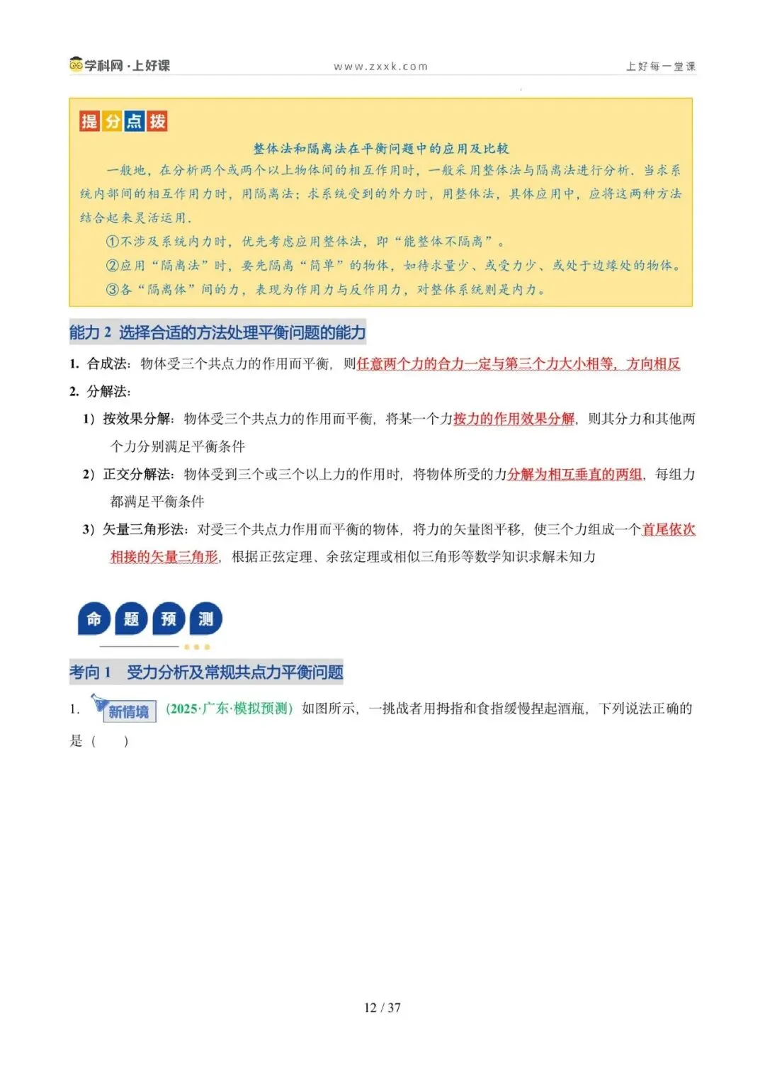 1. 理解力和力的运算法则,会正确对物体进行受力分析,会选择合适的方法处理静态平衡问题