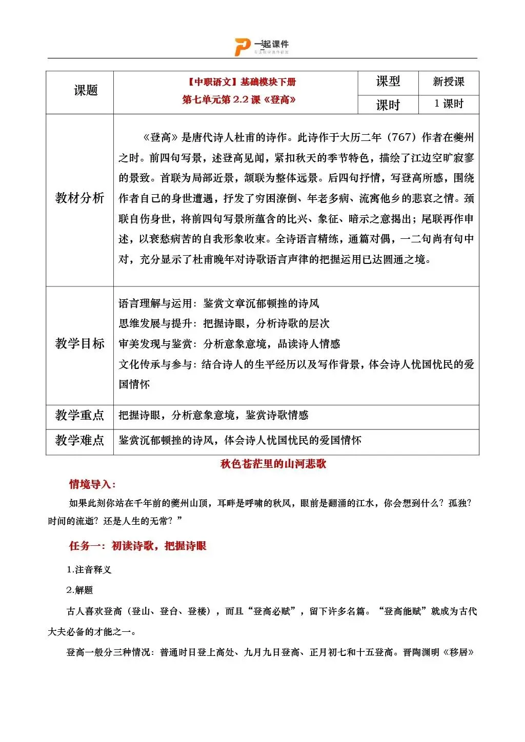 【中职语文基础模块下】| 《登高》:课件+教学设计