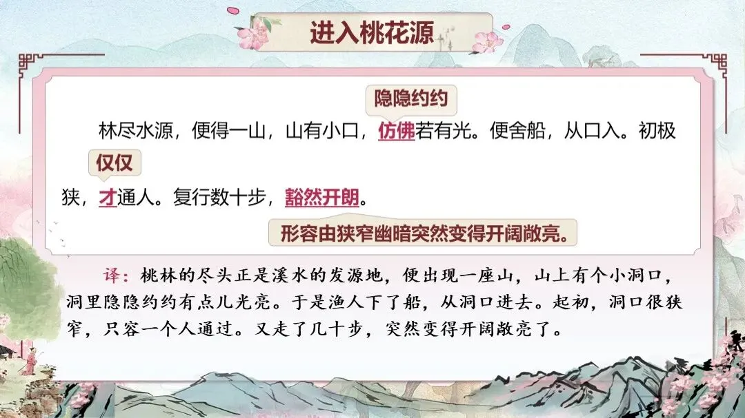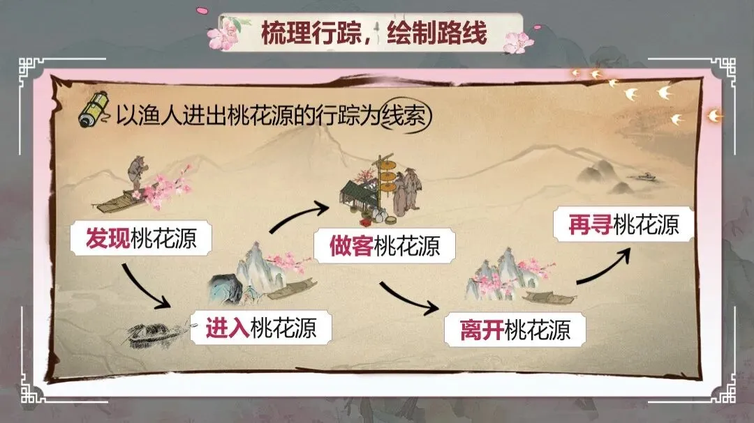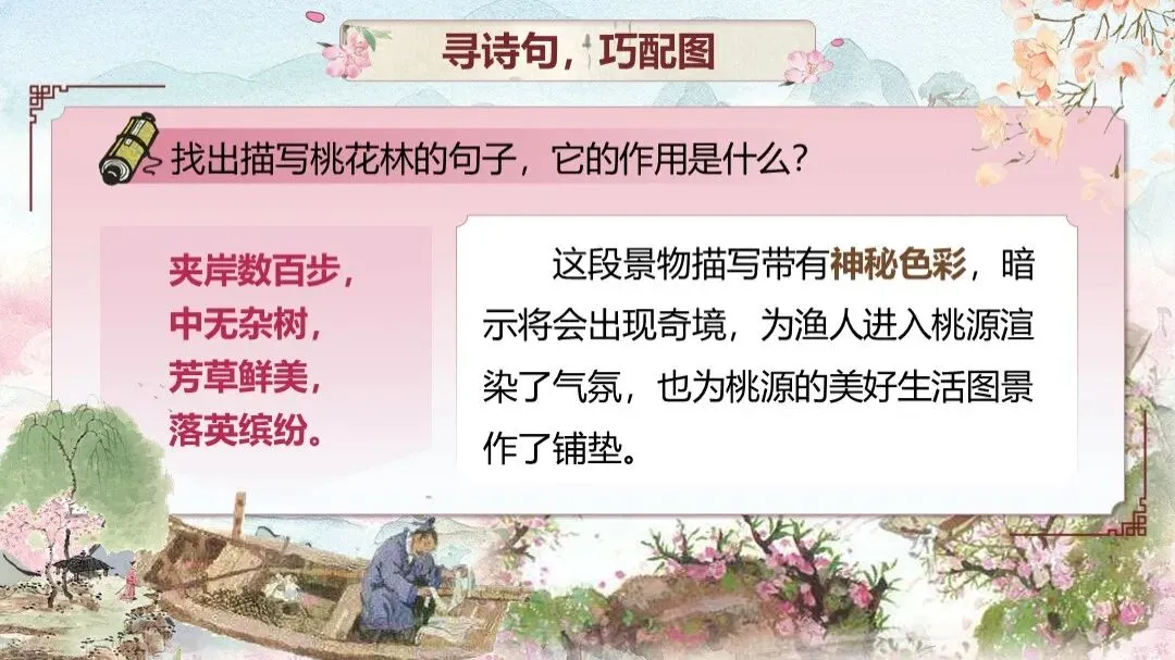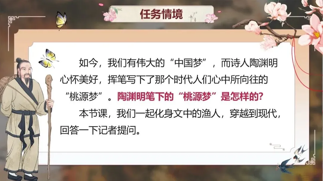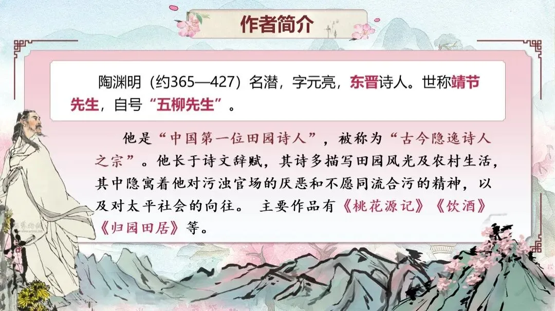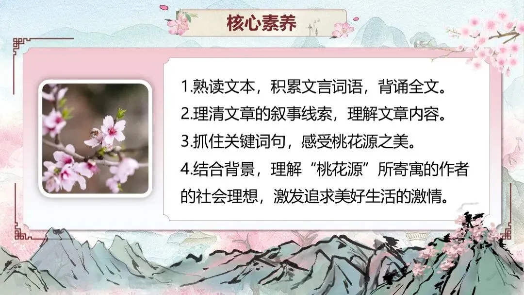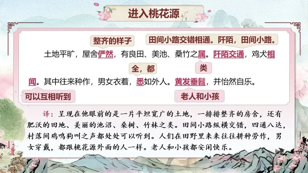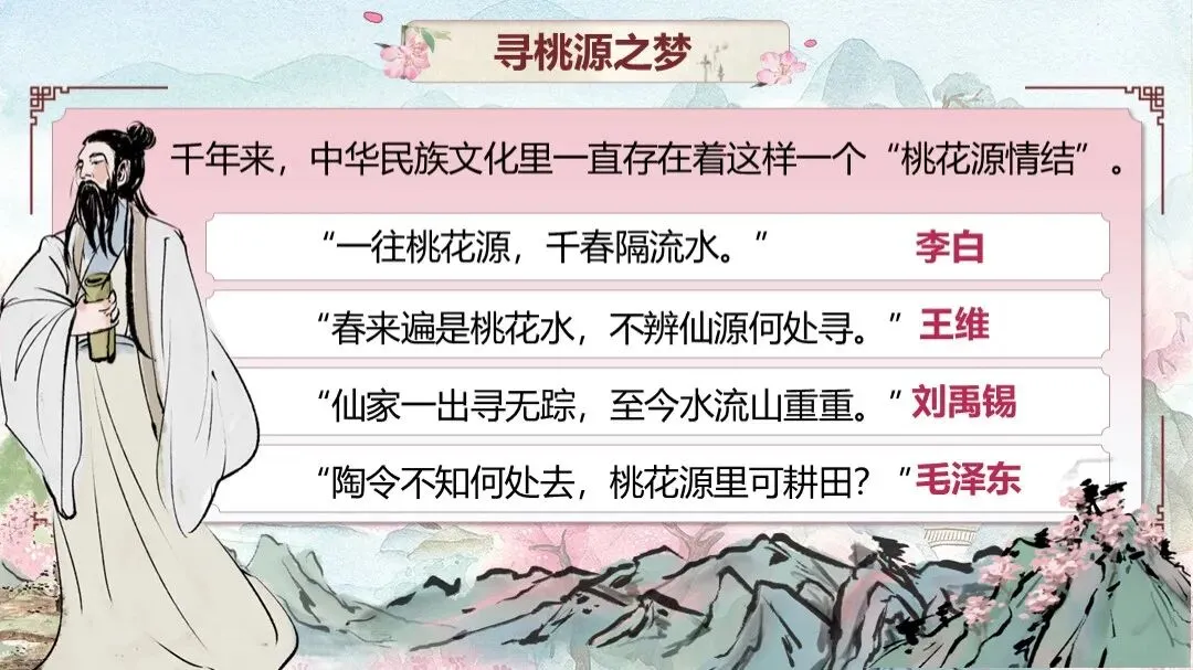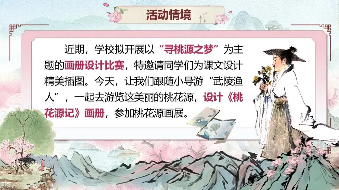 《桃花源记》是部编版教材八年级下册第三单元的第一篇课文,本文以渔人进出桃花源为线索,描绘了一幅自由安乐、恬静自然、幸福美好的人间生活图景,塑造了一个与污浊黑暗社会相对立的美好境界,以寄托自己的政治理想。