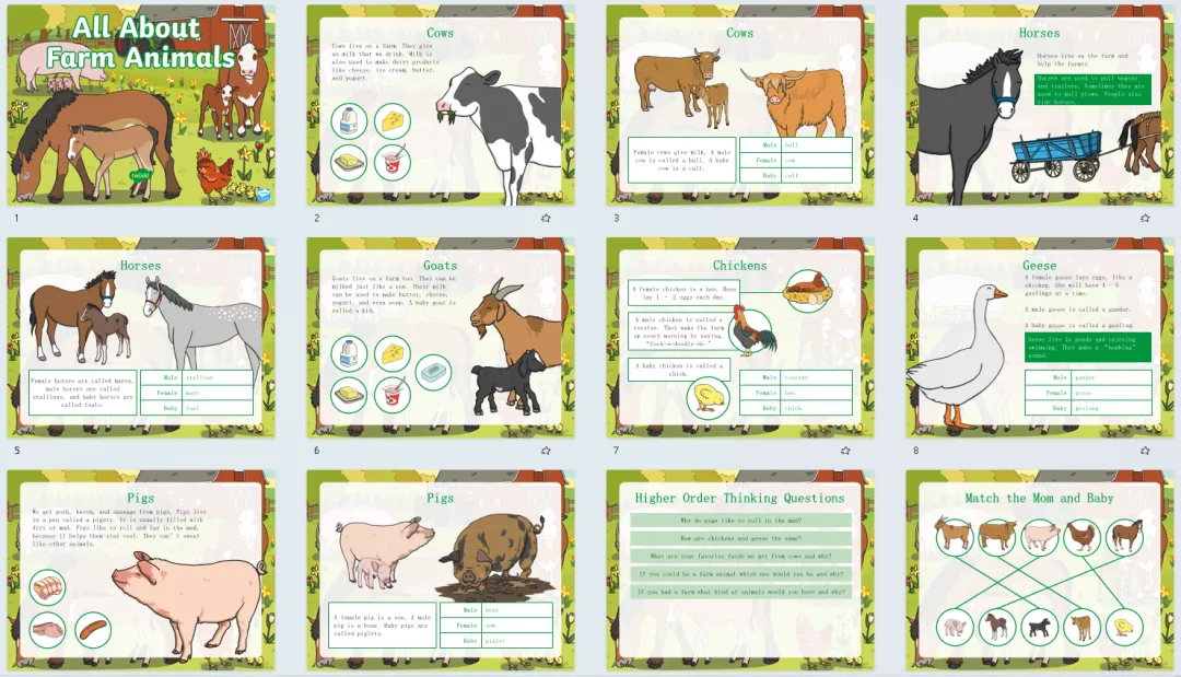 今天分享的是动物主题趣味英语学习素材,含6套精美课件、7套大转盘、还有海报、卡片和练习等,下面是部分内页展示!