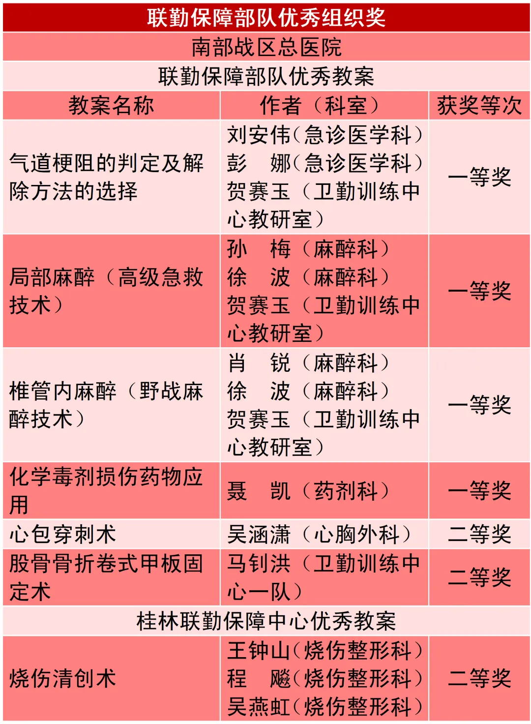 近日,在联勤保障部队和桂林联勤保障中心组织的战伤救治技术优秀教案课件评比活动中,我院凭借扎实的教学基础与出色的战救训练实力,荣获联勤保障部队“优秀组织奖”,并摘得联勤保障部队优秀教案一等奖4项、二等奖2项,以及桂林联勤保障中心优秀教案二等奖1项。