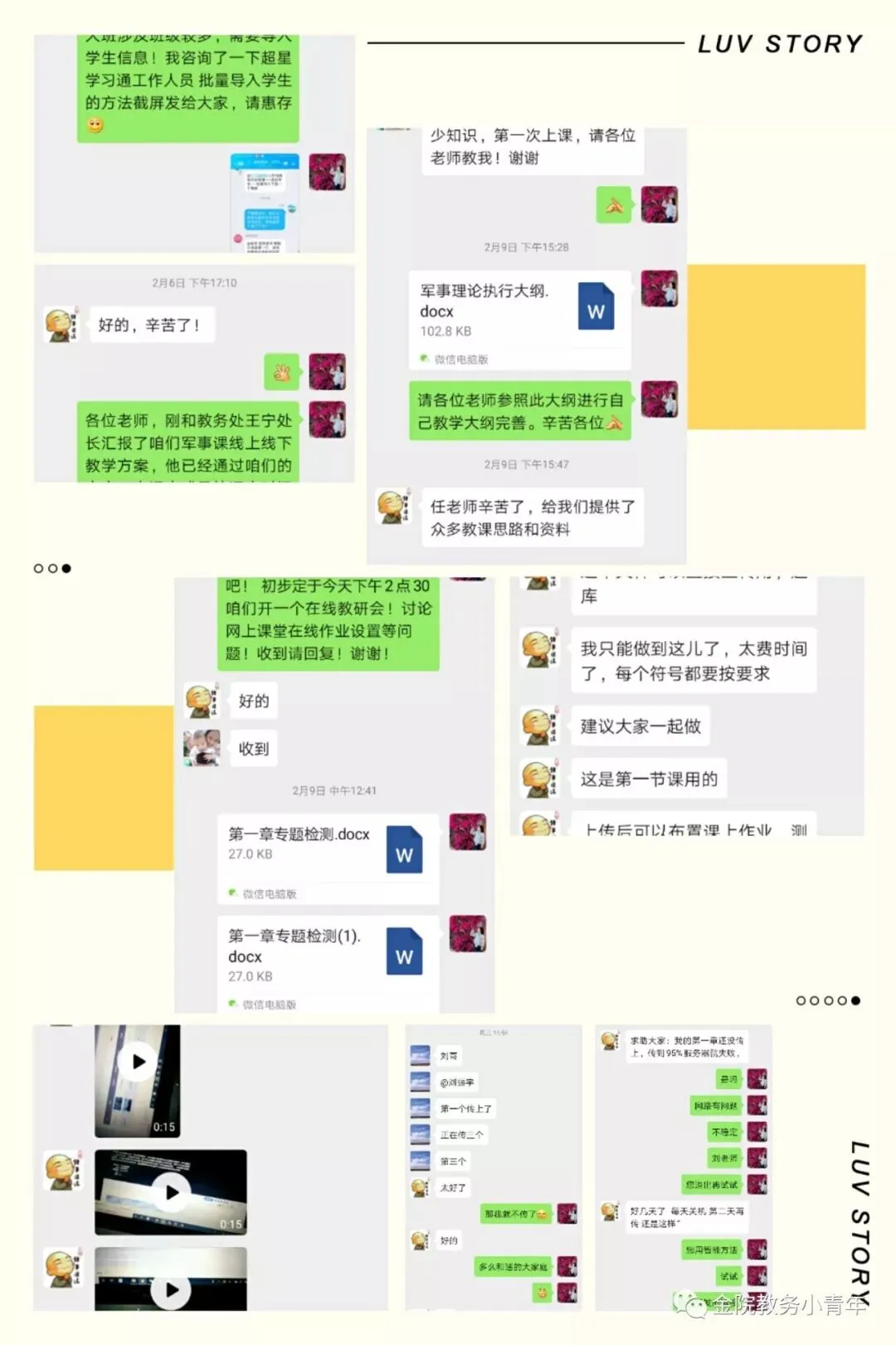 教学中遇到的一些学习通教学中的技术问题,老师通过自己建课过程中的经验进行在线交流,顺利完成,班级建立、教学文件的上传,刘震宇老师制作的国防知识在线题库分享给大家,任芳老师修订的教学执行大纲老师们在线积极讨论,查漏补缺,白亚兵老师帮助刘震宇老师上传视频资料,等感人的事件,激励着军事教研室老师在疫情来临时一次在线教学的互助温暖大家庭。温暖的大家庭打造了一个温馨的军事在线“双育人”课程设计,让军事理论课在线教学第一课,触发学生们家国情怀,弘扬爱国主义精神,传播国防知识。