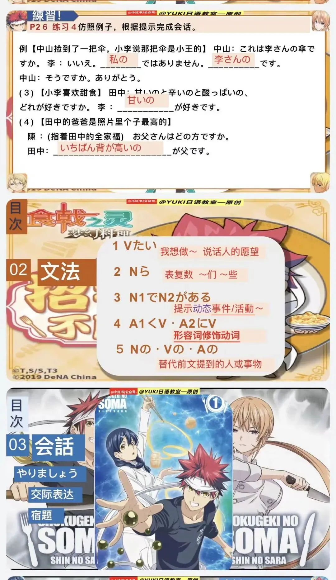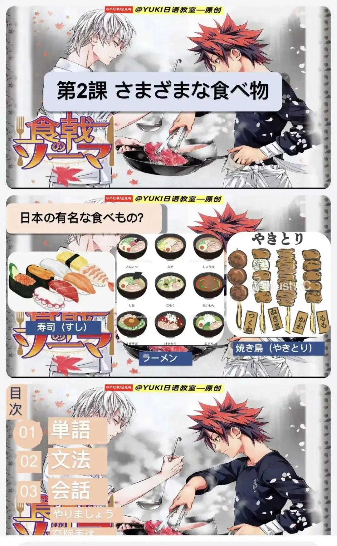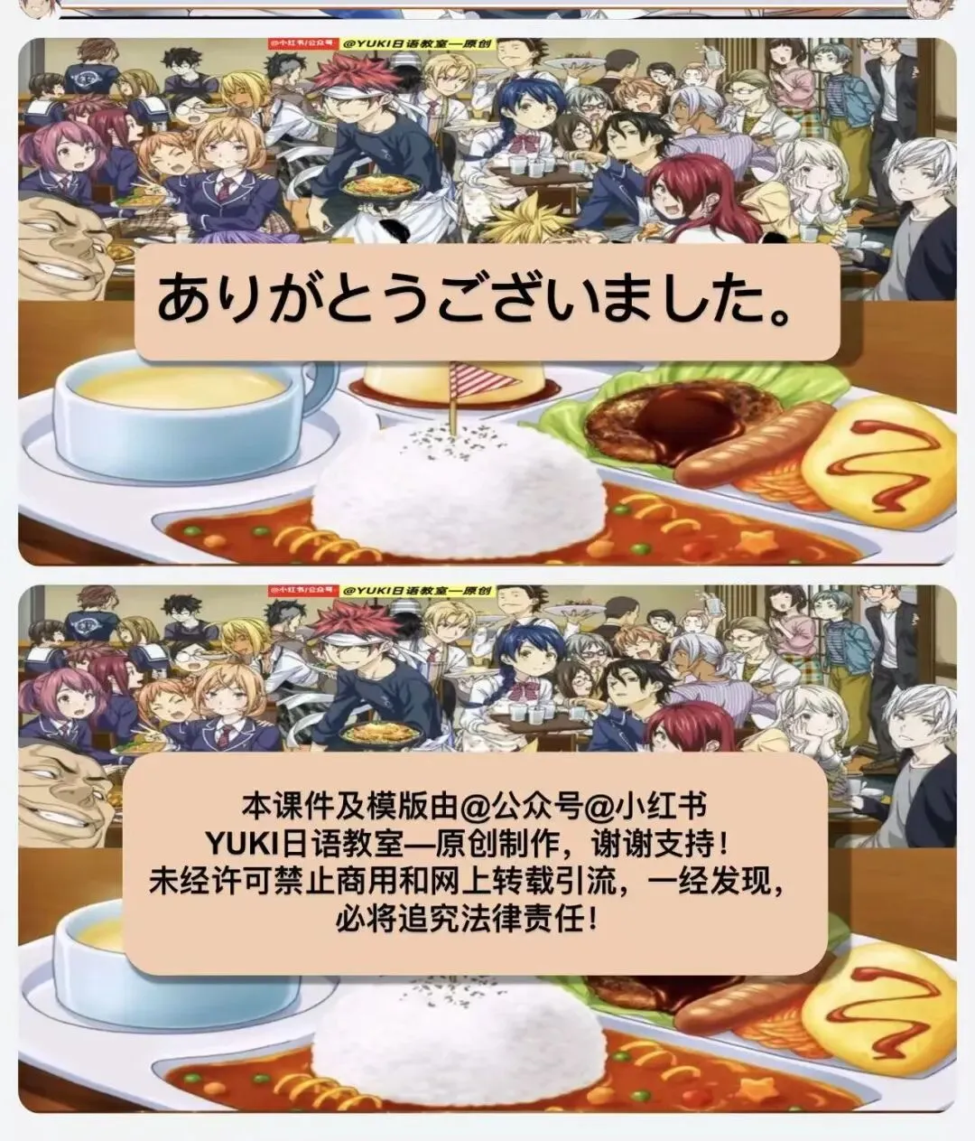 新版人教日语八年级动漫版课件第2课(食戟之灵-原创动漫版课件:)-本课件为原创课件由-@公众号--YUKI日语教室 制作。本课件未授权给任何人进行商用,二次引流和销售,盗版课件属于违法侵权行为,请大家谨防假冒,谢谢支持原创日语资料的制作!