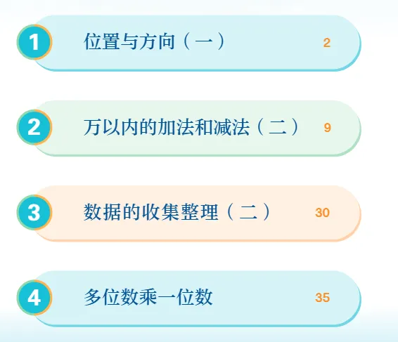 2.掌握万以内加减法的计算法则,能正确进行计算和验算;熟练掌握多位数乘一位数、除数是一位数除法的口算和笔算方法,理解0 在乘除法中的特性。