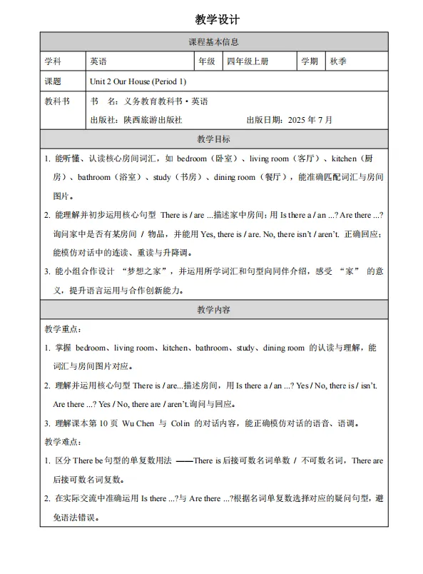 新教材英语四年级下册教案+课件+学习任务单(陕旅版2026春)