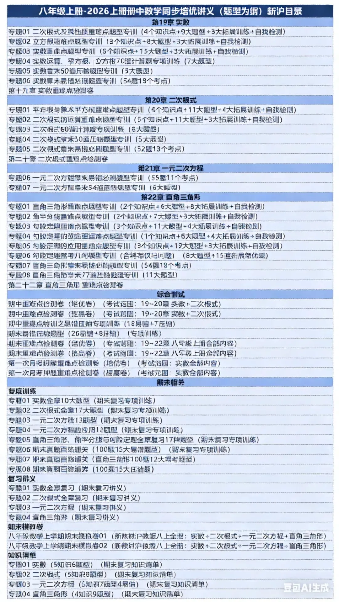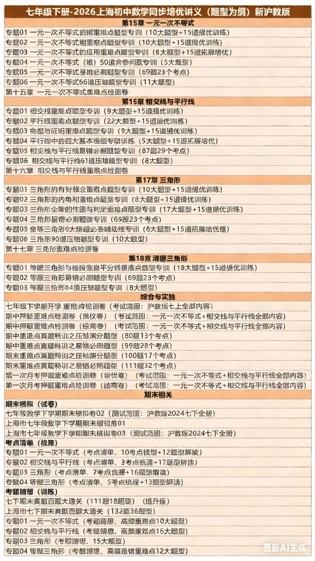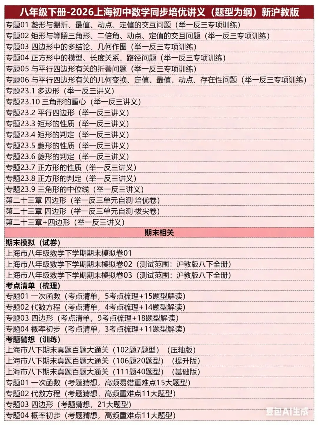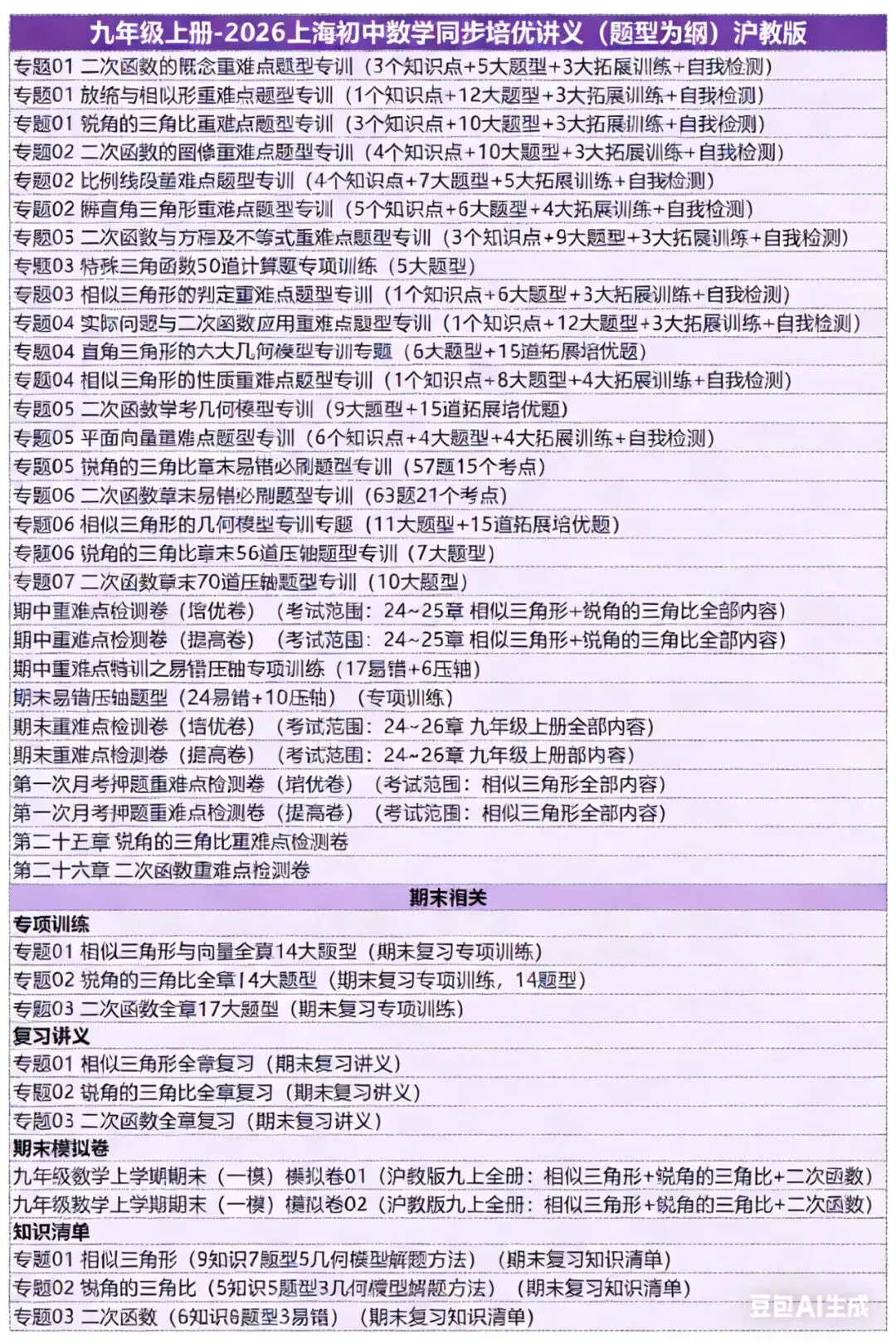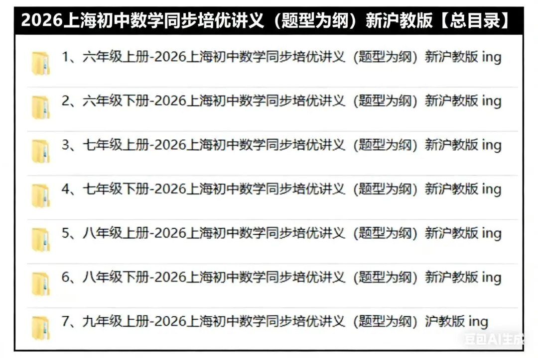 2026上海初中数学同步培优讲义(题型为纲),新沪教版+各类阶段测试卷,6-8年级上下册9年级上册,全word无水印,可编辑可打印,教师版❗学生版齐全。每个年级包含同步讲义、月考、期中、期末卷、专项卷、知识清单期末相关内容。6-8上下册皆为新教材。