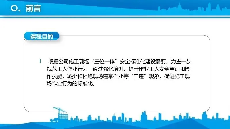 (一)课件背景。为响应公司施工现场“三位一体”安全标准化建设要求,解决钢筋作业中可能存在的违章操作等问题,特打造此培训课件。