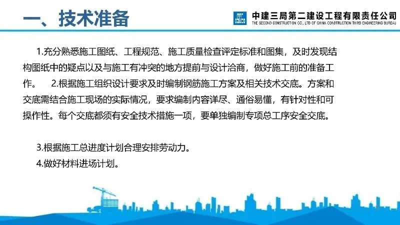技术准备:要求熟悉施工图纸、工程规范等,编制钢筋施工方案及技术交底,合理安排劳动力和材料进场计划。
