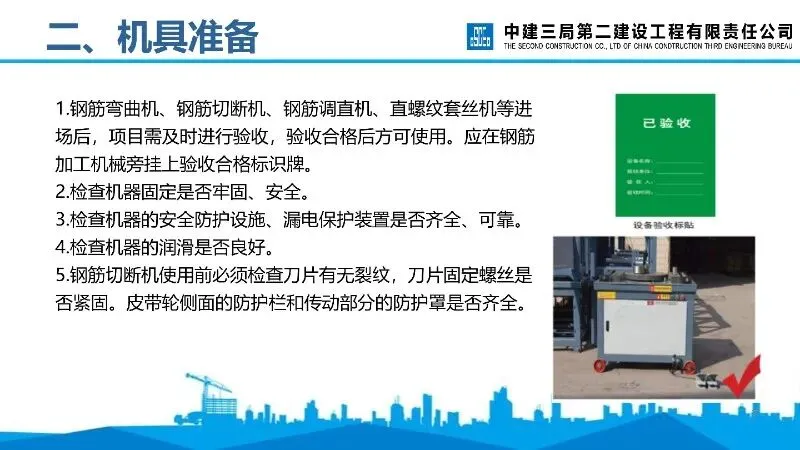 机具准备:钢筋弯曲机、切断机等设备进场后需验收合格,检查机器固定、安全防护设施、漏电保护装置等是否达标。