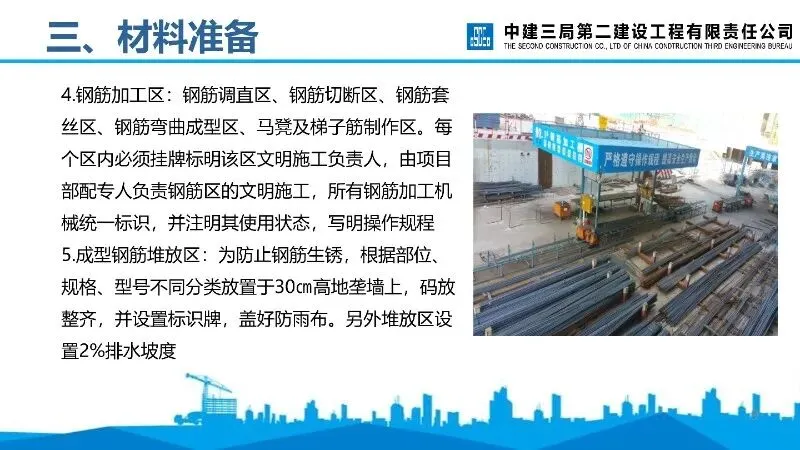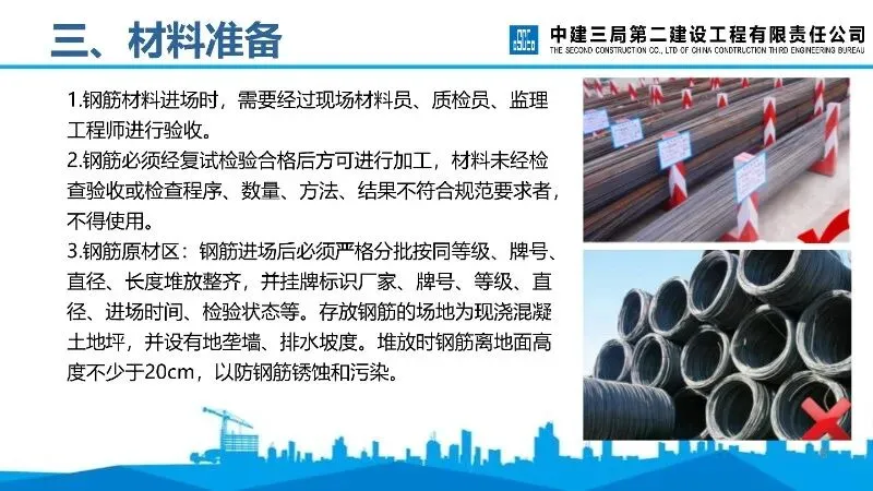 材料准备:钢筋进场需经多方验收,复试合格后方可加工,原材、加工区、成型钢筋需分类堆放并规范标识。