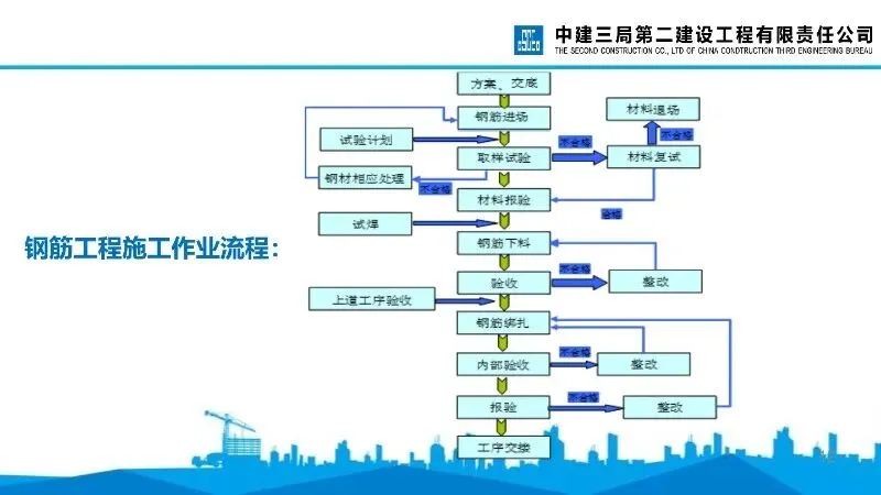 (二)作业流程。详细呈现钢筋工程施工作业全流程,包括钢筋进场、材料报验、取样试验、材料复试、试焊、钢筋下料、绑扎、内部验收、报验、工序交接等环节,每个环节均明确合格与不合格的处理方式。