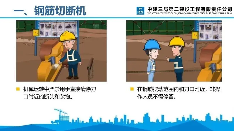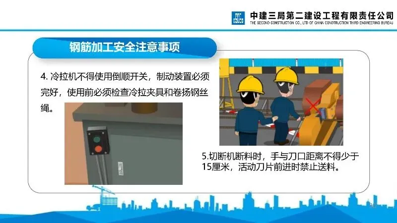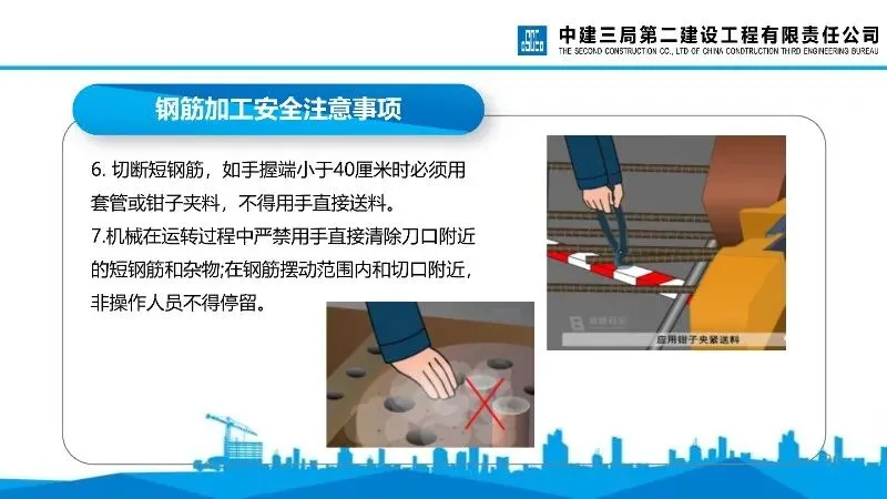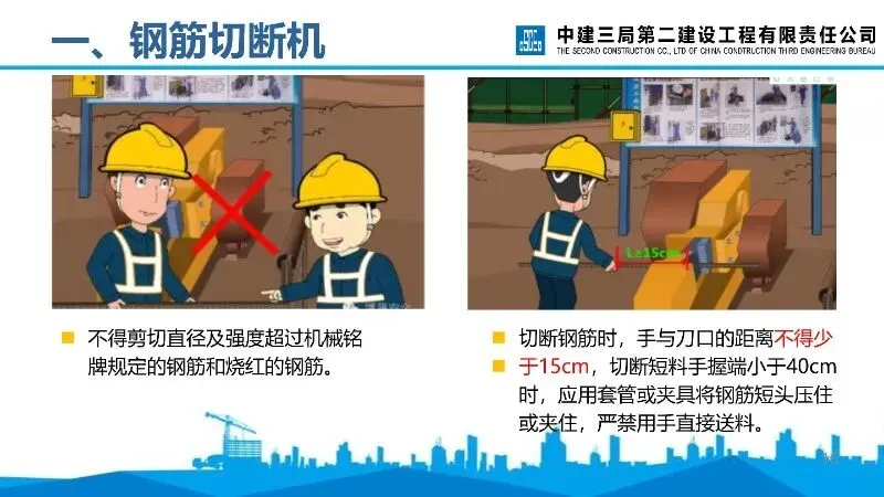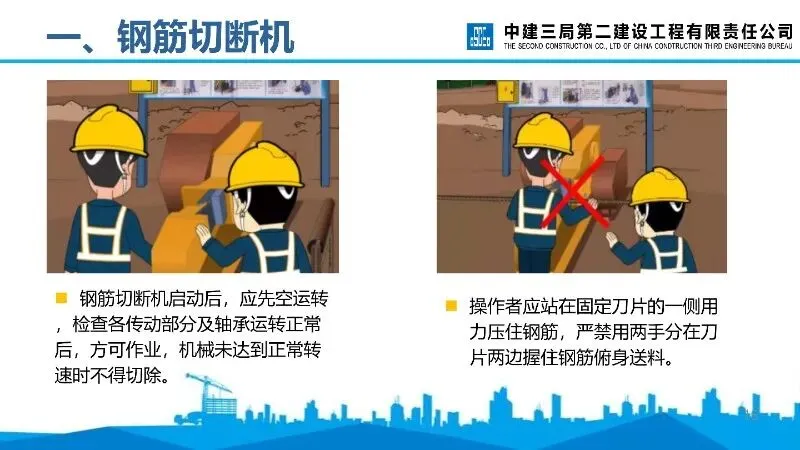 钢筋切断机:启动后需空运转检查,操作者需站在固定刀片一侧送料,严禁剪切超规格及烧红钢筋,手与刀口保持安全距离。