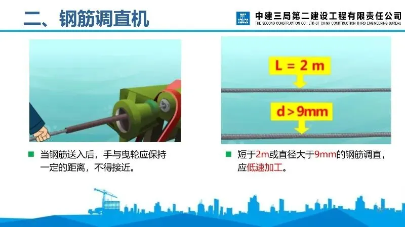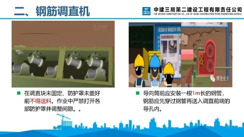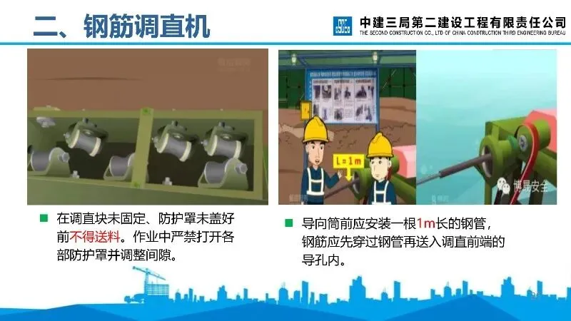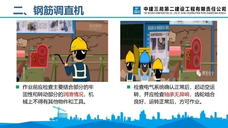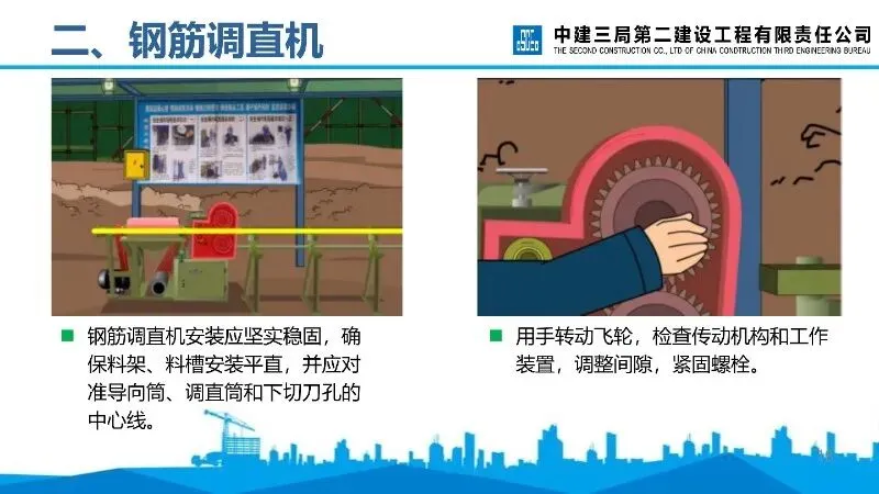 钢筋调直机:安装需稳固,作业前检查传动机构、润滑等情况,调直块固定和防护罩盖好后方可送料,短料或粗直径钢筋需低速加工。