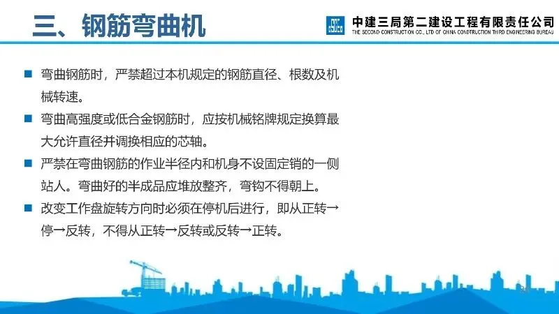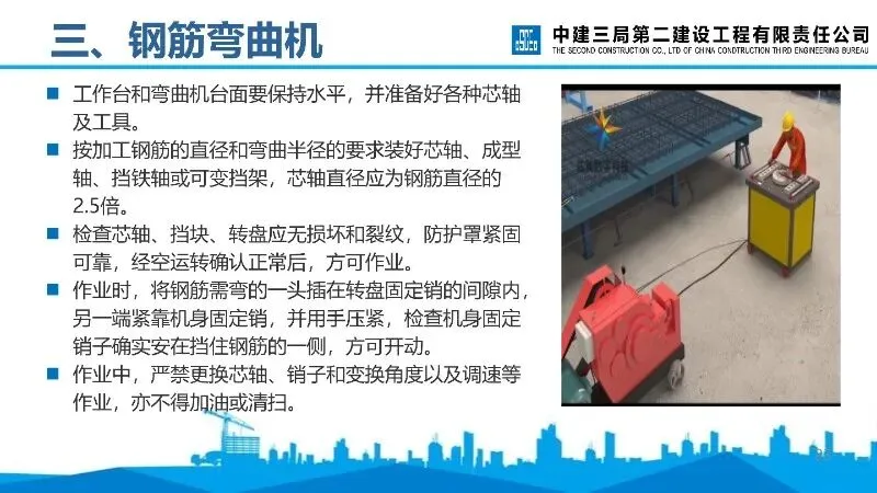 钢筋弯曲机:工作台需水平,按要求安装芯轴等部件,作业中严禁更换部件、调速等,弯曲钢筋时遵守直径、根数等限制。
