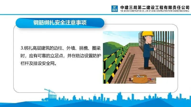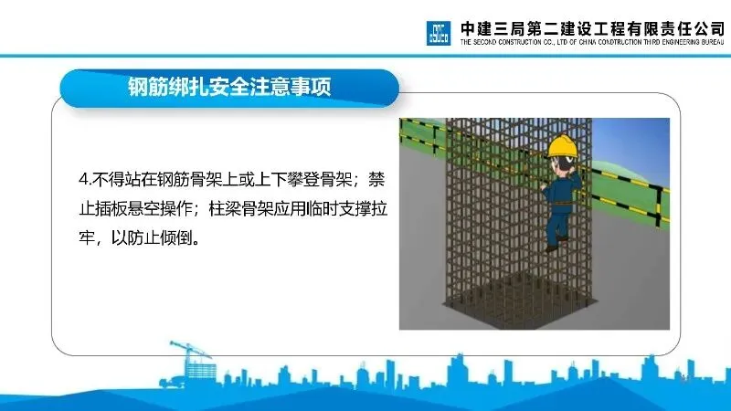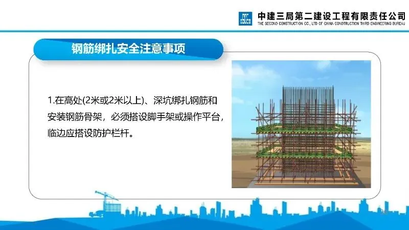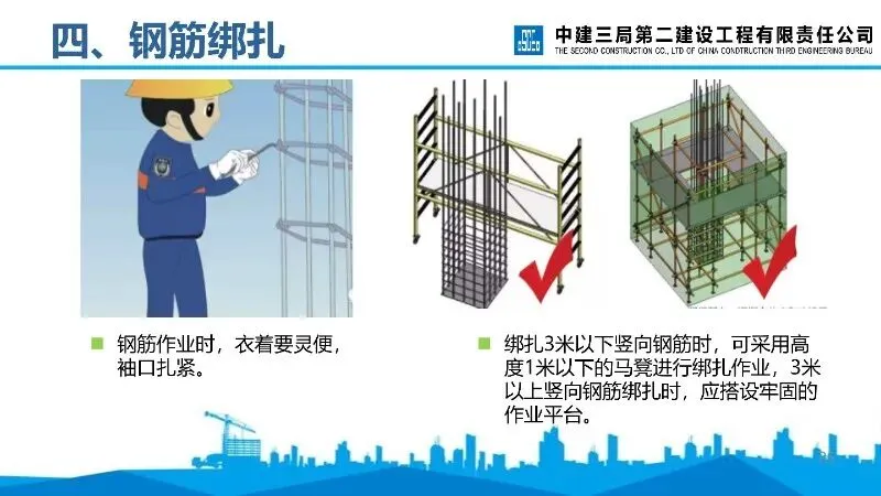 钢筋绑扎:作业时衣着灵便,竖向钢筋绑扎需根据高度搭建作业平台或马凳,高处作业需佩戴安全带,钢筋骨架需加临时支撑。