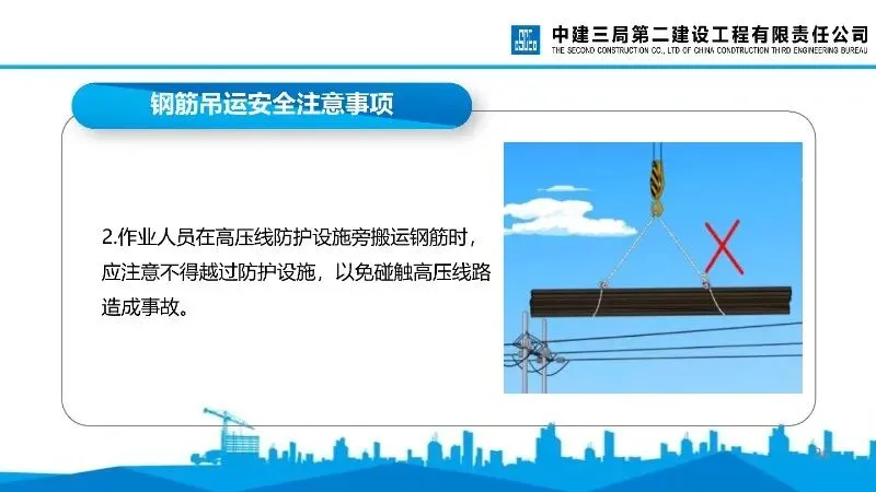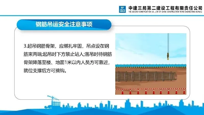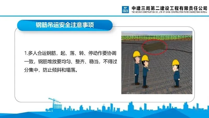 钢筋吊运安全:多人合运需动作协调,避开高压线防护设施,起吊骨架绑扎牢固,吊点合理,下方禁止站人,落吊时需待骨架降至安全高度方可靠近。