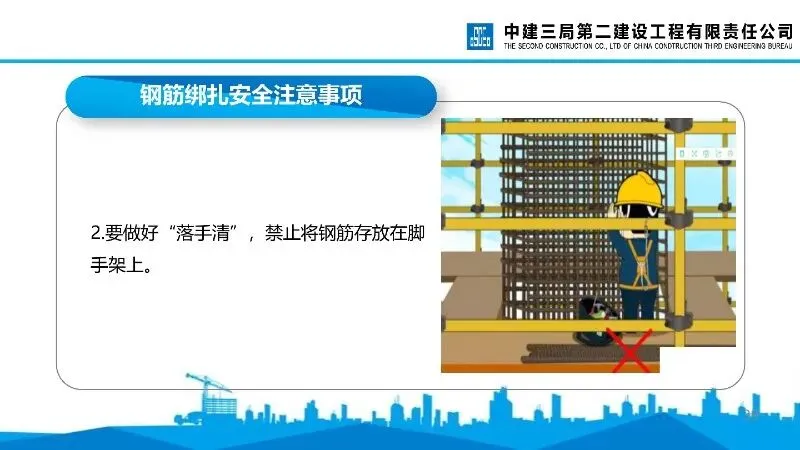 钢筋绑扎安全:高处作业需搭设脚手架或操作平台,做好临边防护,禁止在脚手架存放钢筋,不得站在钢筋骨架上操作。