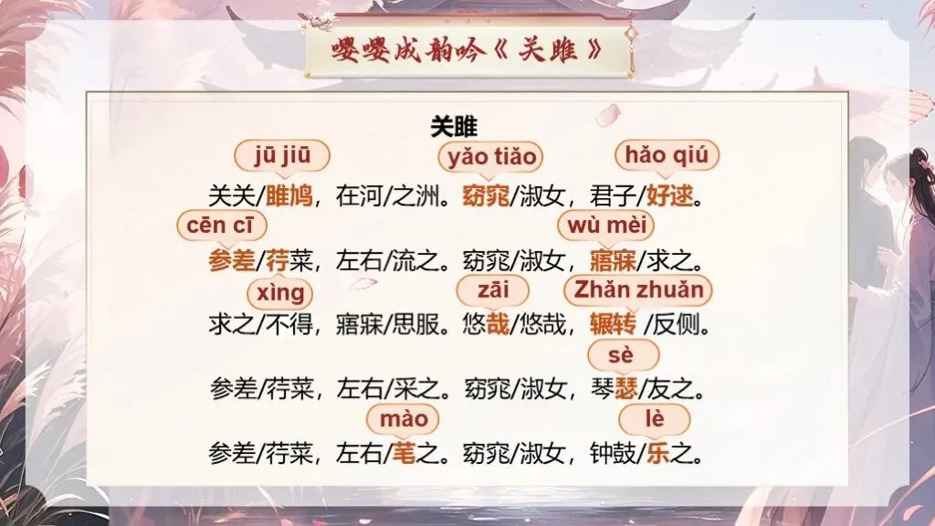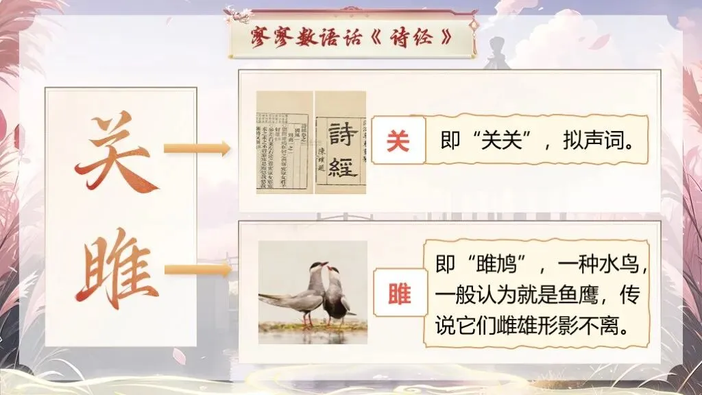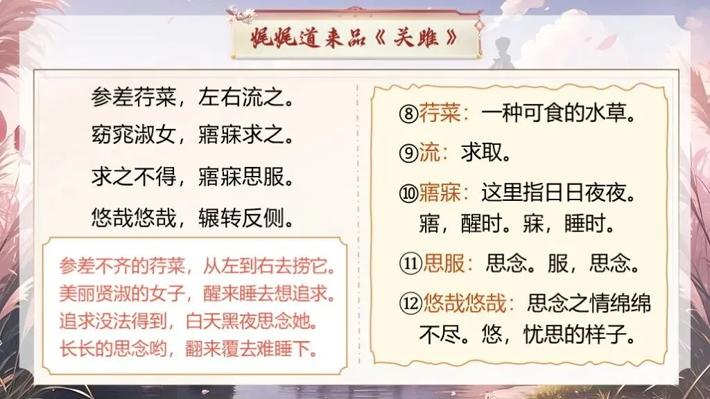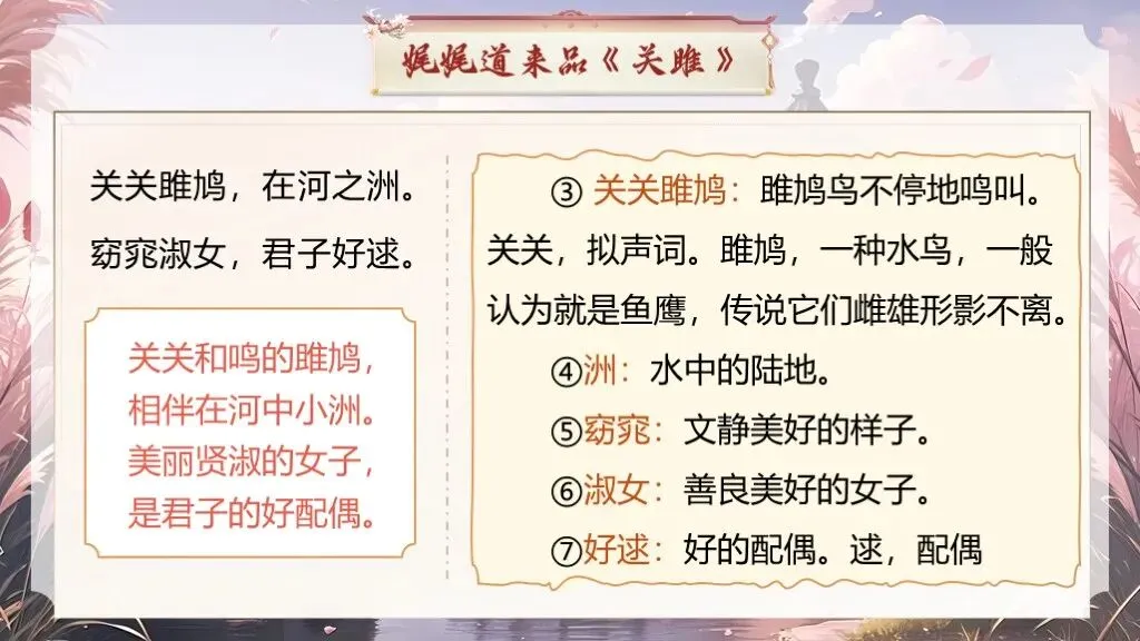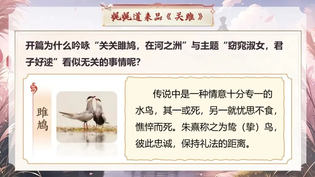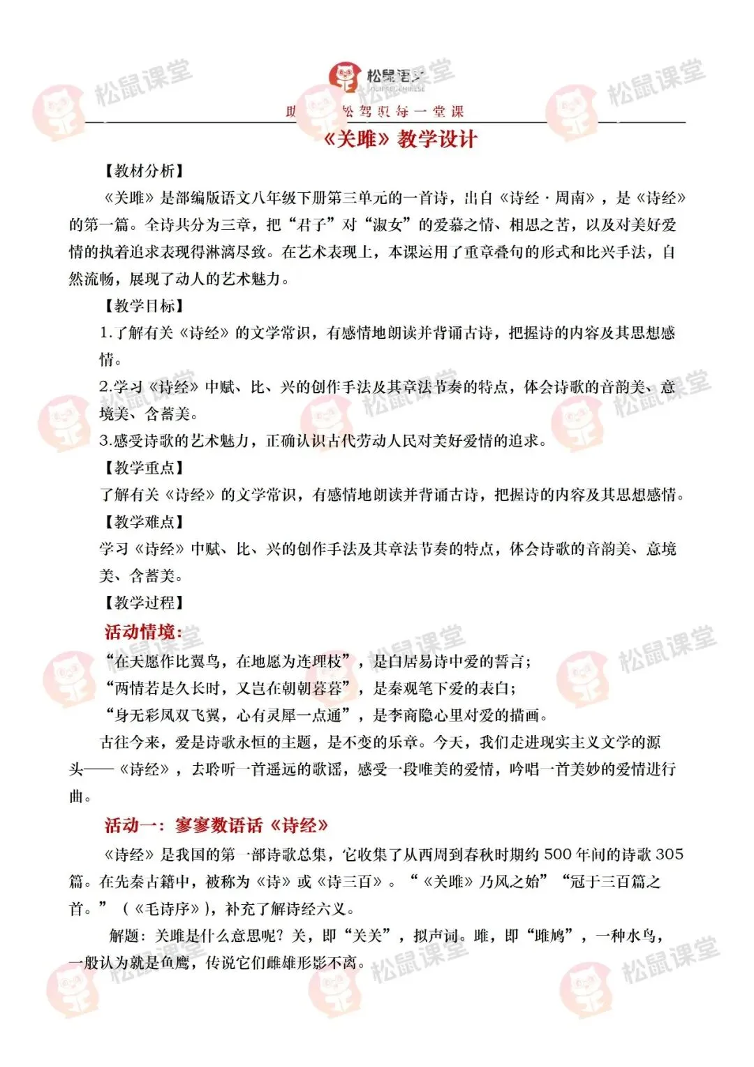 《关雎》是部编版语文八年级下册第三单元的一首诗,出自《诗经·周南》,是《诗经》的第一篇。全诗共分为三章,把“君子”对“淑女”的爱慕之情、相思之苦,以及对美好爱情的执着追求表现得淋漓尽致。在艺术表现上,本课运用了重章叠句的形式和比兴手法,自然流畅,展现了动人的艺术魅力。