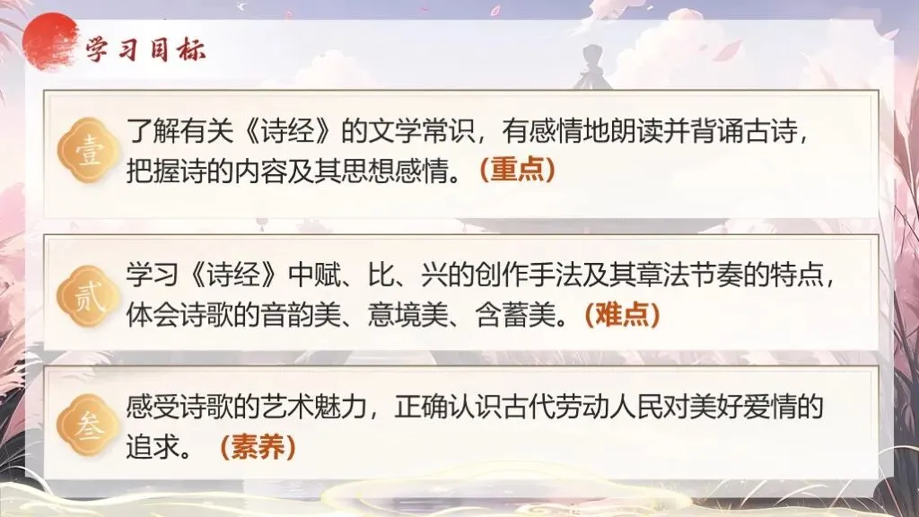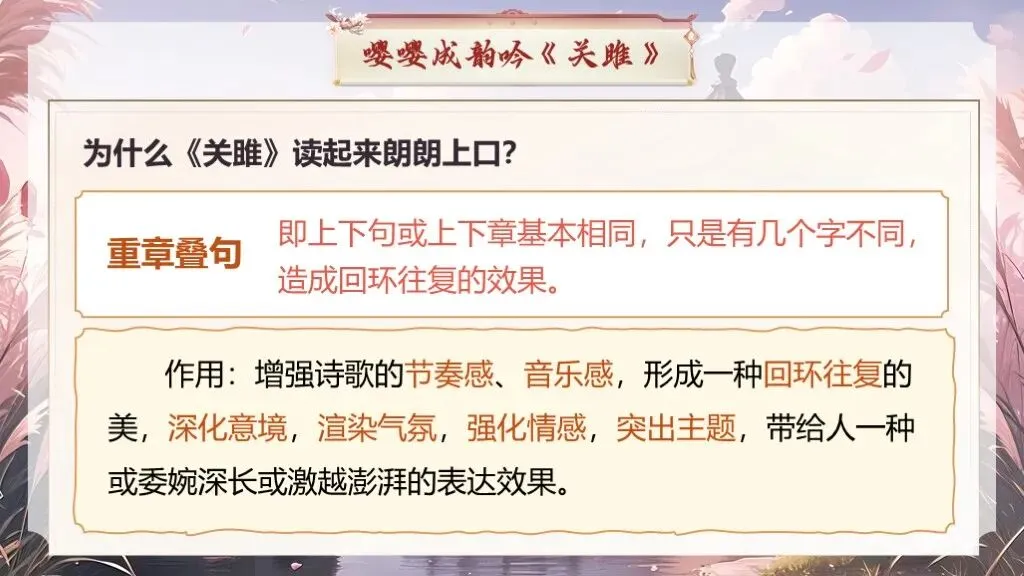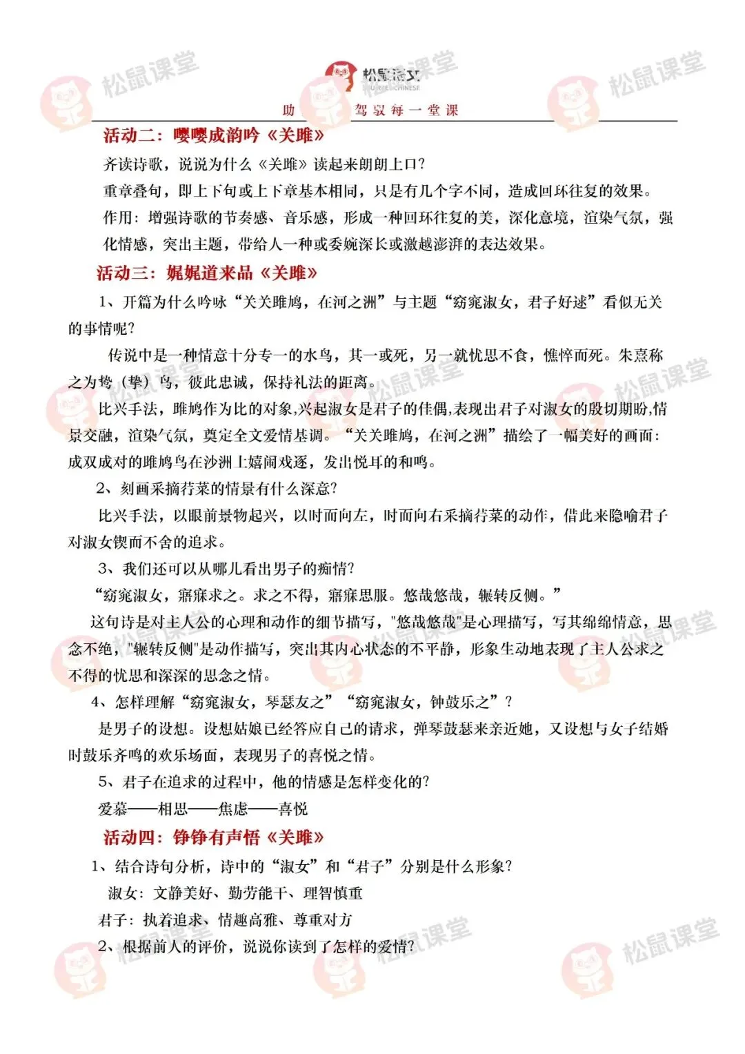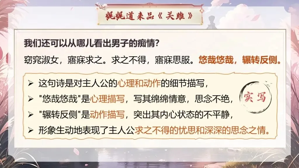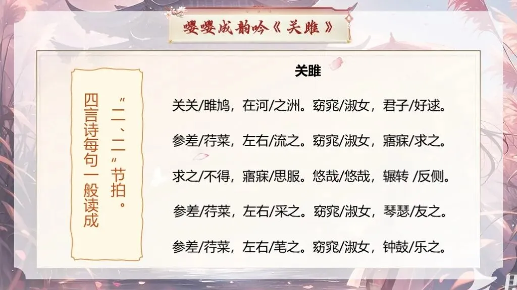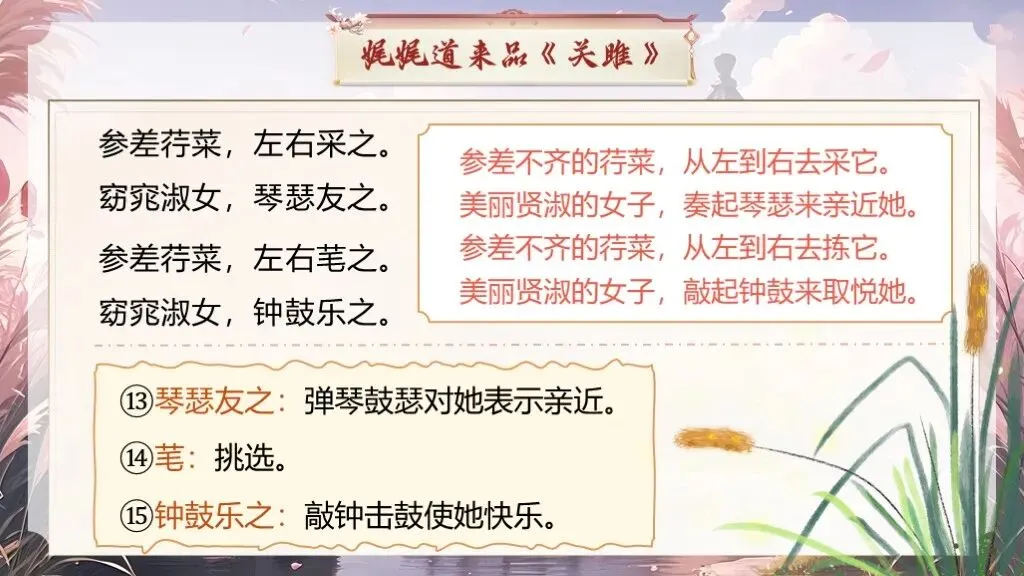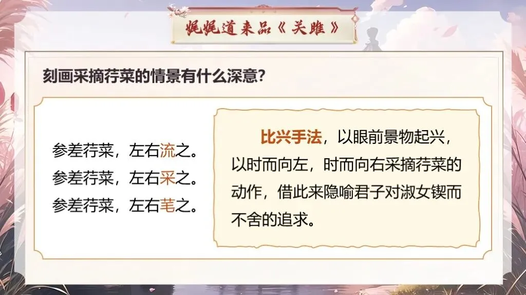 《关雎》是部编版语文八年级下册第三单元的一首诗,出自《诗经·周南》,是《诗经》的第一篇。全诗共分为三章,把“君子”对“淑女”的爱慕之情、相思之苦,以及对美好爱情的执着追求表现得淋漓尽致。在艺术表现上,本课运用了重章叠句的形式和比兴手法,自然流畅,展现了动人的艺术魅力。