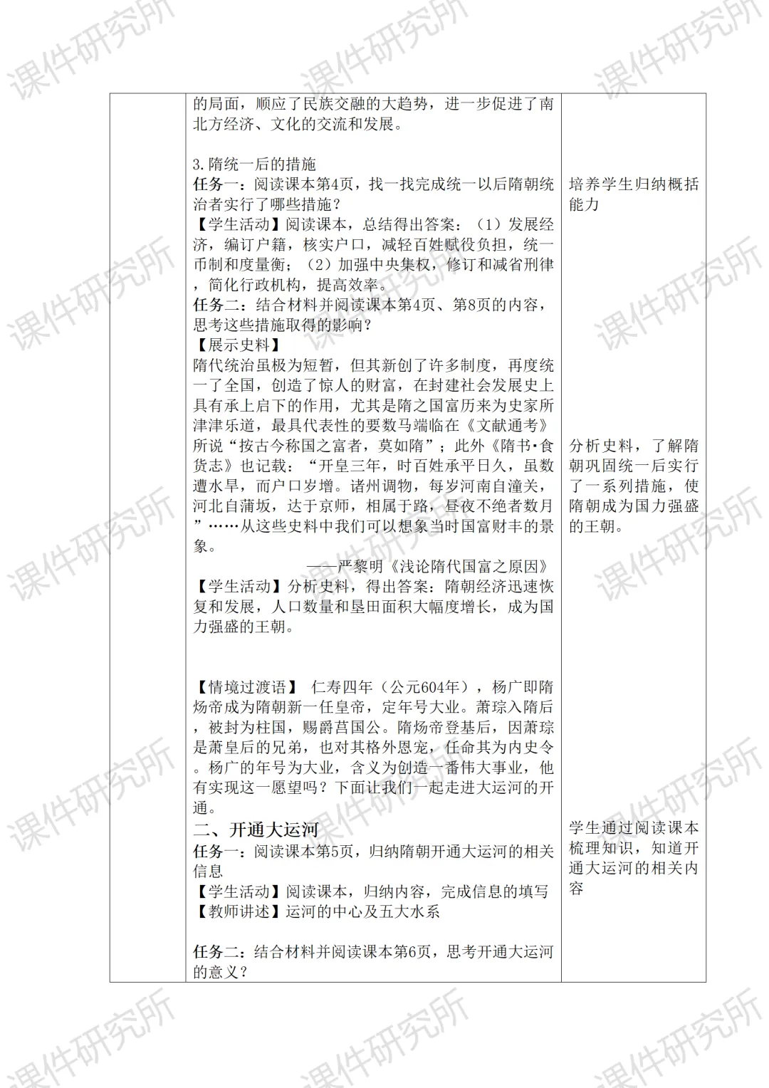 最后通过萧琮因为童谣引发隋炀帝猜忌被杀死,使学生知道隋朝是在中国经历长期分裂之后建立的统一王朝,外表强盛至极,但在大一统的躯壳下涌动着各种割据势力的暗流。统治阶级内部埋藏着不安定因素,统治基础很不稳固。