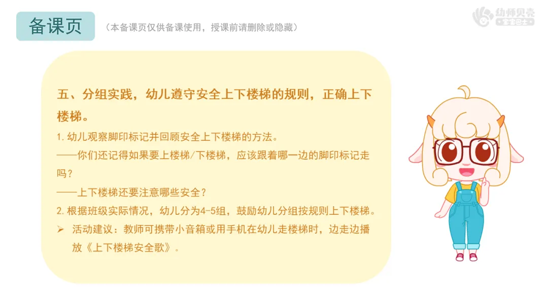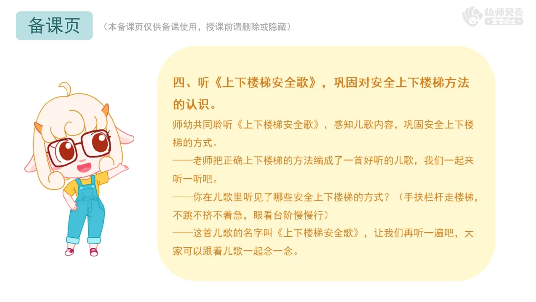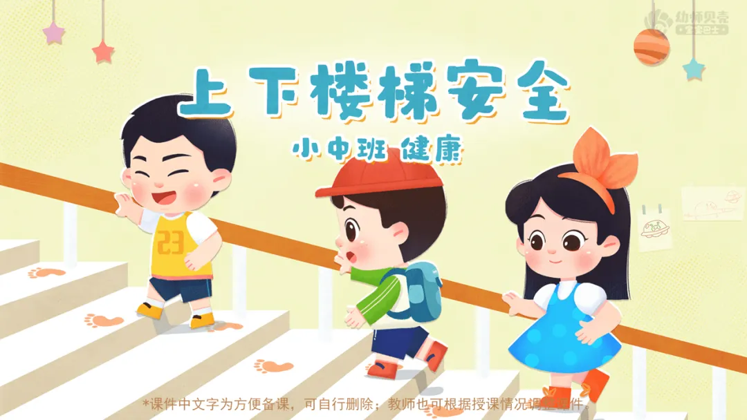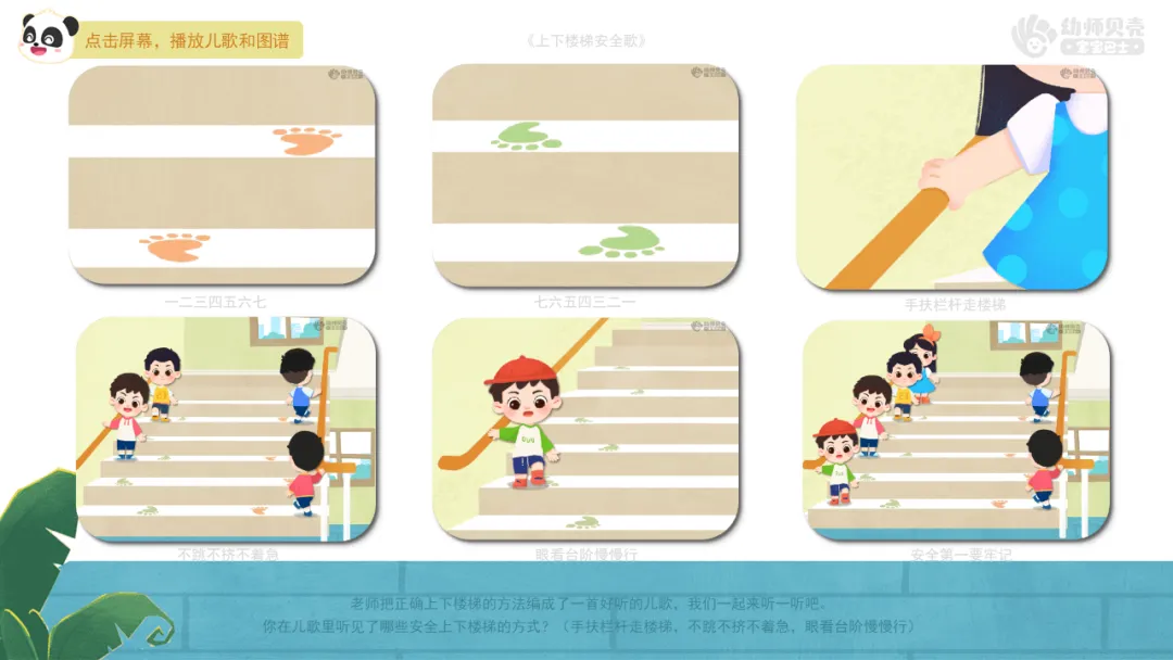 ——这首儿歌的名字叫《上下楼梯安全歌》,让我们再听一遍吧,大家可以跟着儿歌一起念一念。