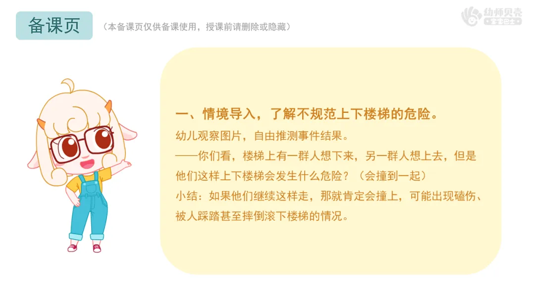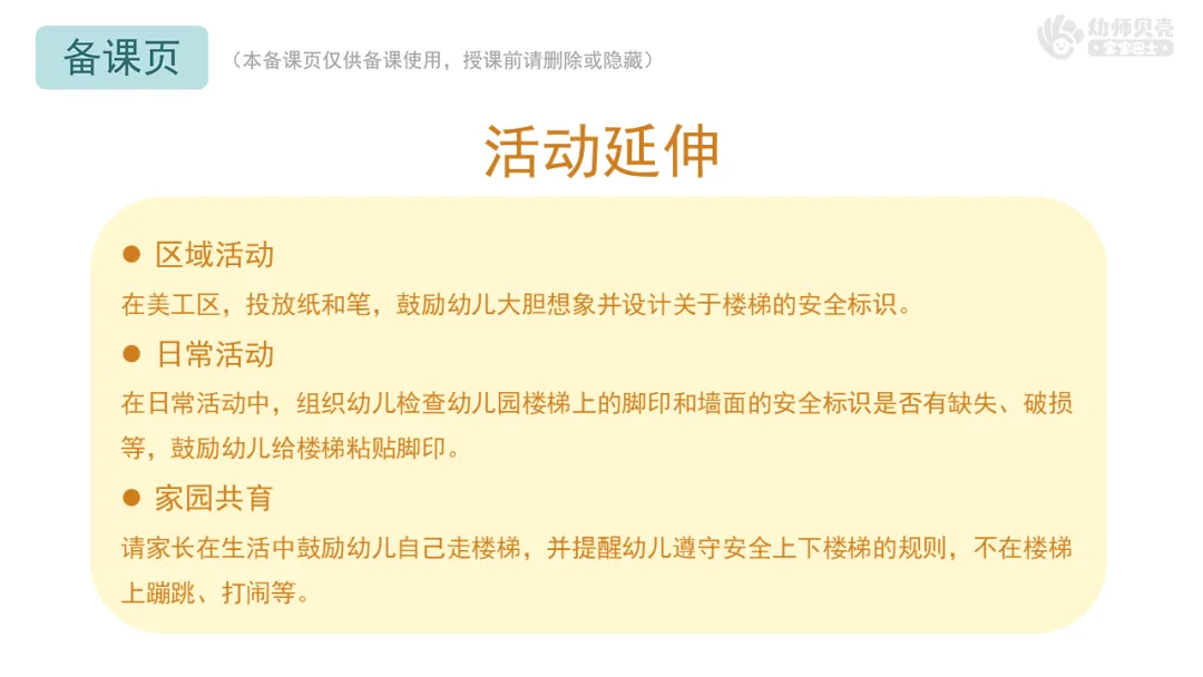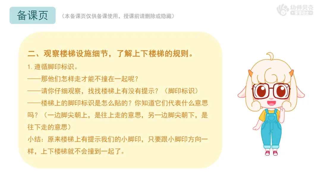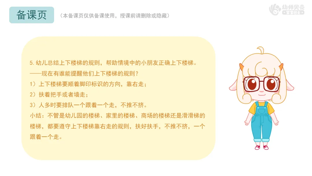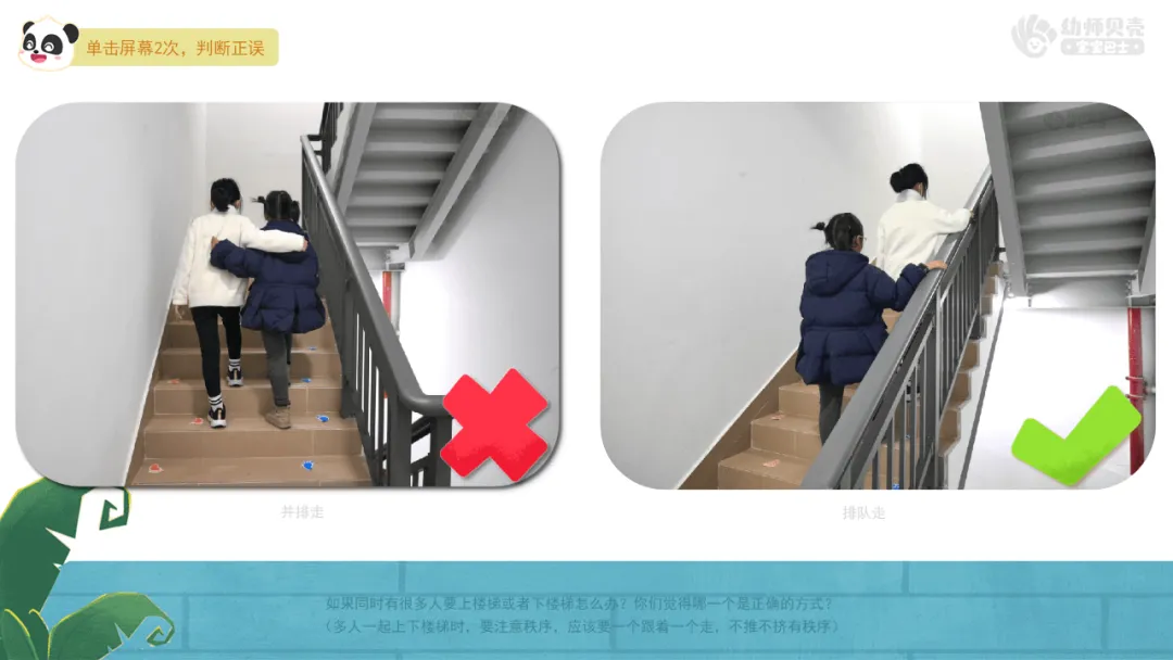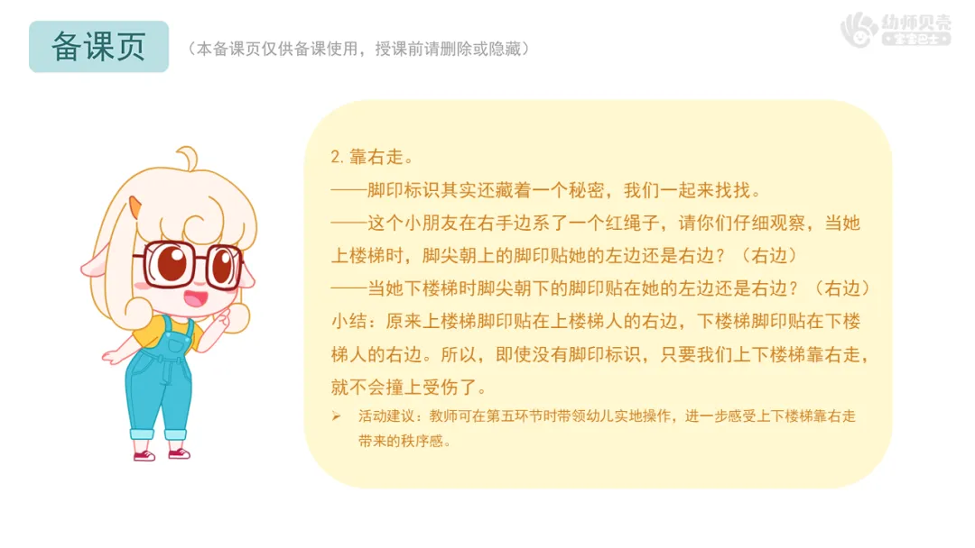 Ø活动建议:教师可在第五环节时带领幼儿实地操作,进一步感受上下楼梯靠右走带来的秩序感。