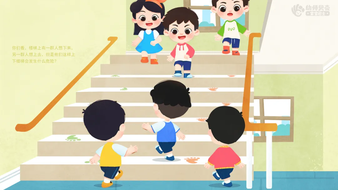 ——你们看,楼梯上有一群人想下来,另一群人想上去,但是他们这样上下楼梯会发生什么危险?(会撞到一起)