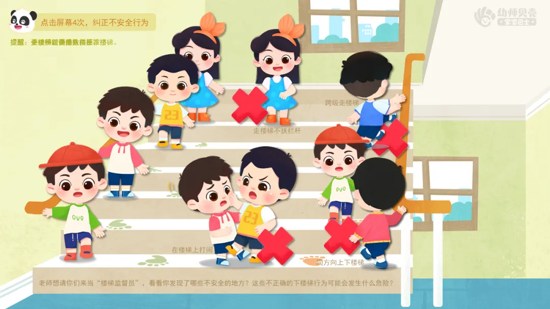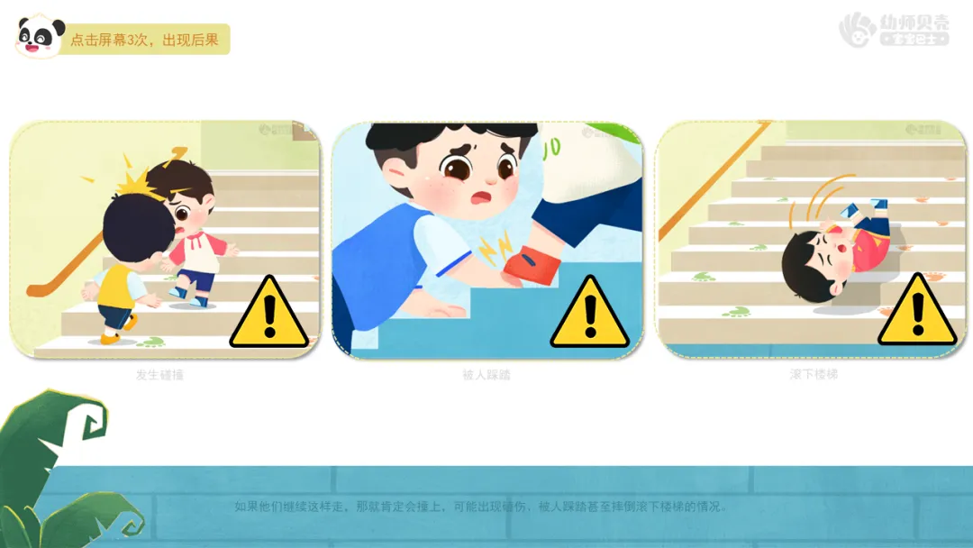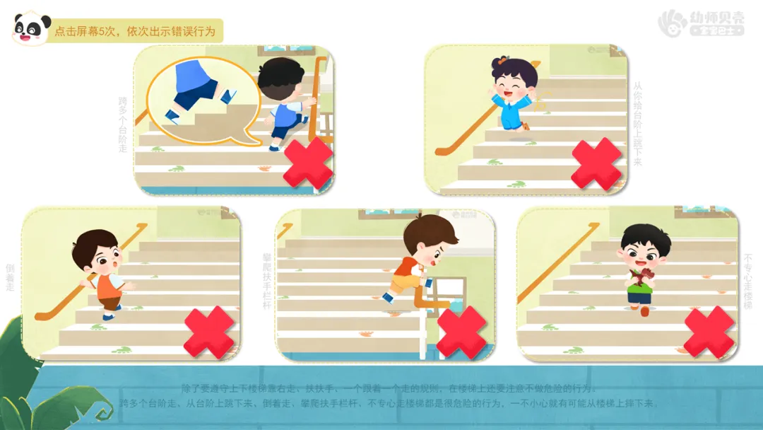 小结:除了要遵守上下楼梯靠右走、扶扶手、一个跟着一个走的规则,在楼梯上还要注意不做危险的行为。跨多个台阶走、从台阶上跳下来、倒着走、攀爬扶手栏杆、不专心走楼梯都是很危险的行为,一不小心就有可能从楼梯上摔下来。