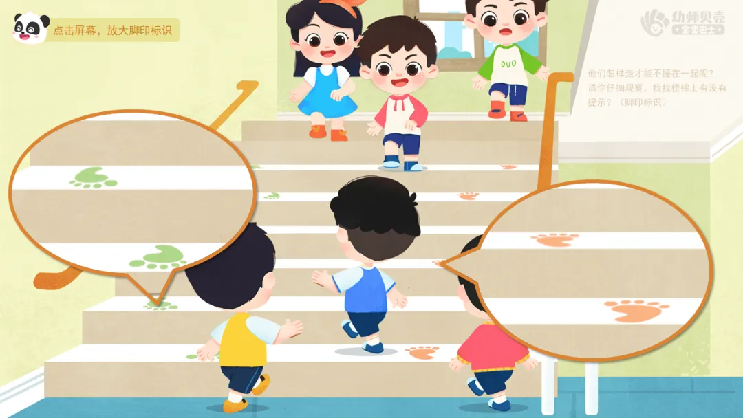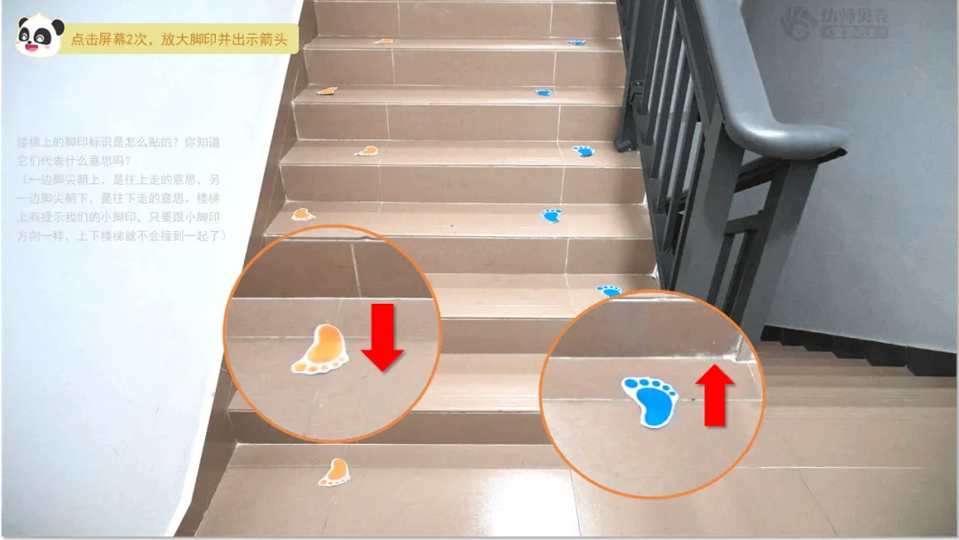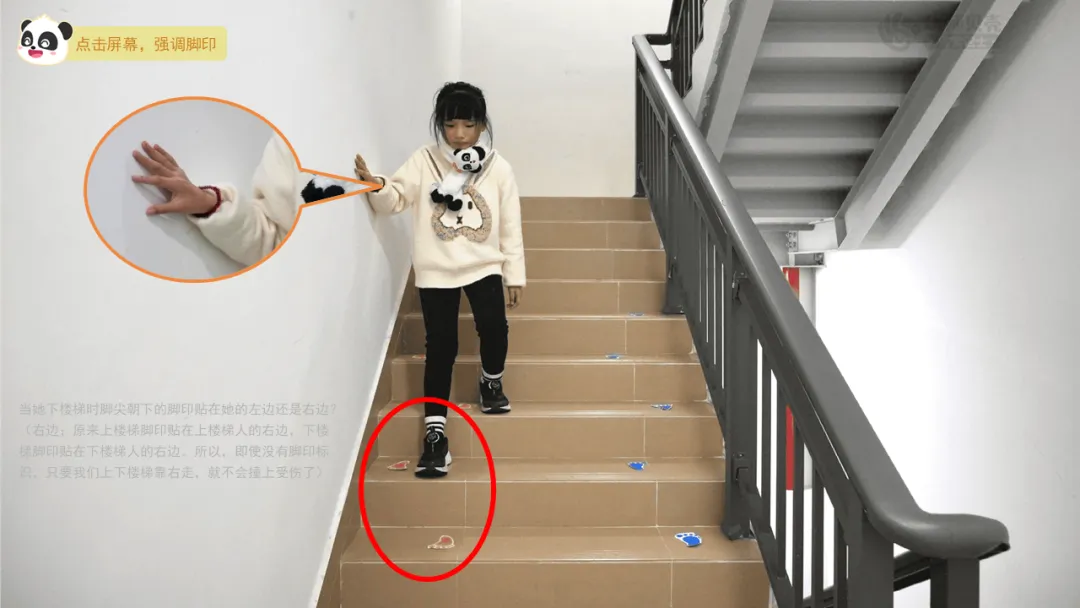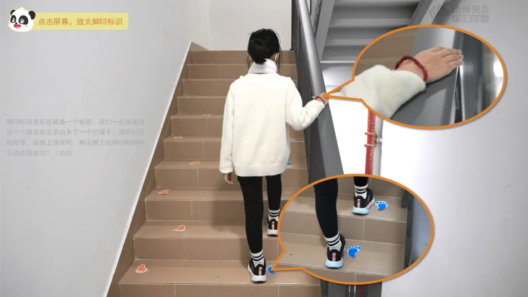 ——请你仔细观察,找找楼梯上有没有提示?(脚印标识)