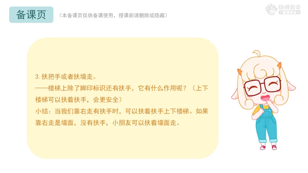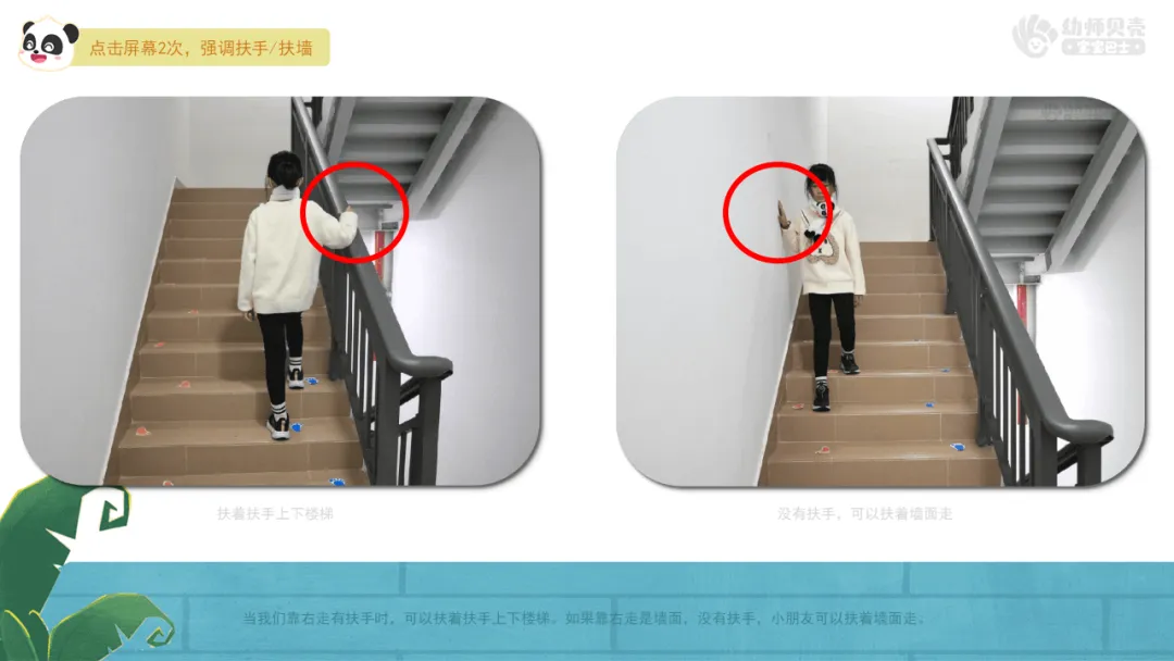 小结:当我们靠右走有扶手时,可以扶着扶手上下楼梯。如果靠右走是墙面,没有扶手,小朋友可以扶着墙面走。