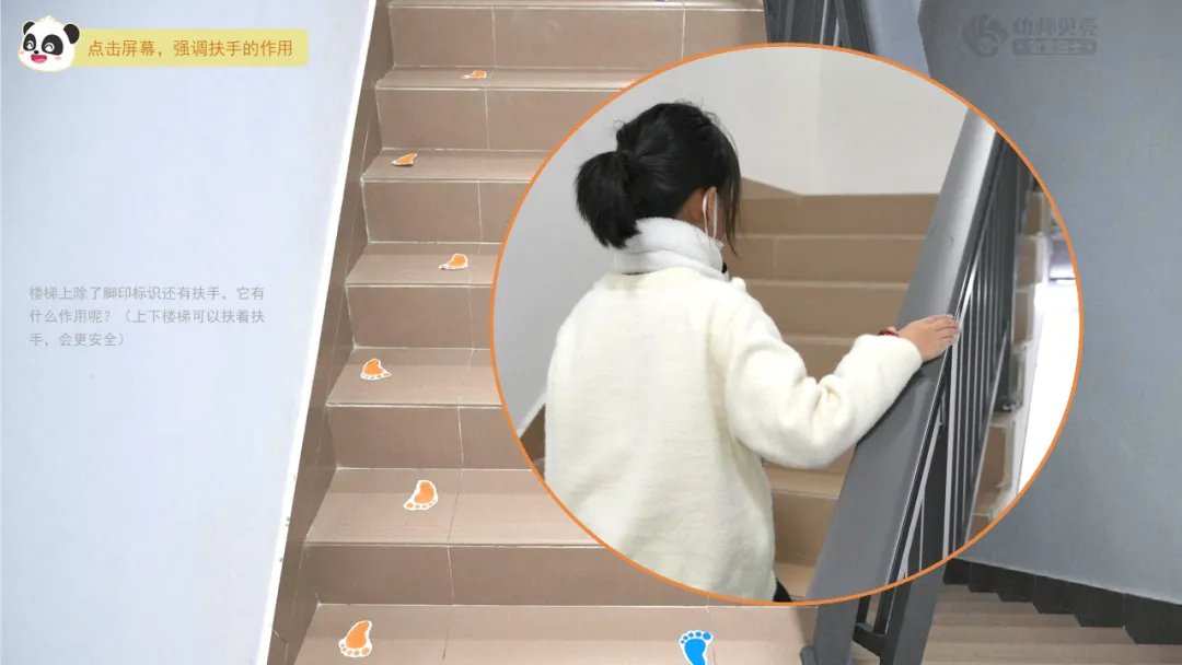 ——楼梯上除了脚印标识还有扶手,它有什么作用呢?(上下楼梯可以扶着扶手,会更安全)
