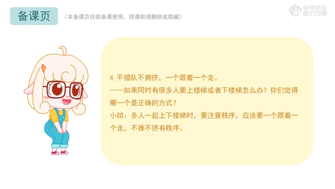 小结:多人一起上下楼梯时,要注意秩序,应该要一个跟着一个走,不推不挤有秩序。