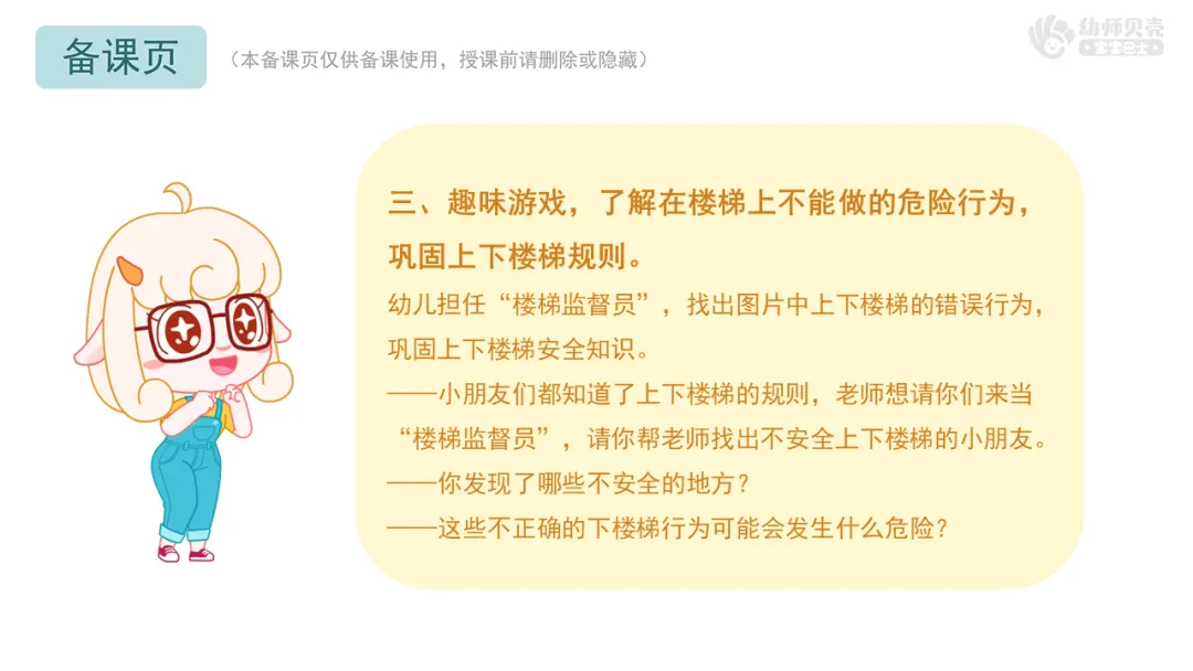 三、趣味游戏,了解在楼梯上不能做的危险行为,巩固上下楼梯规则。