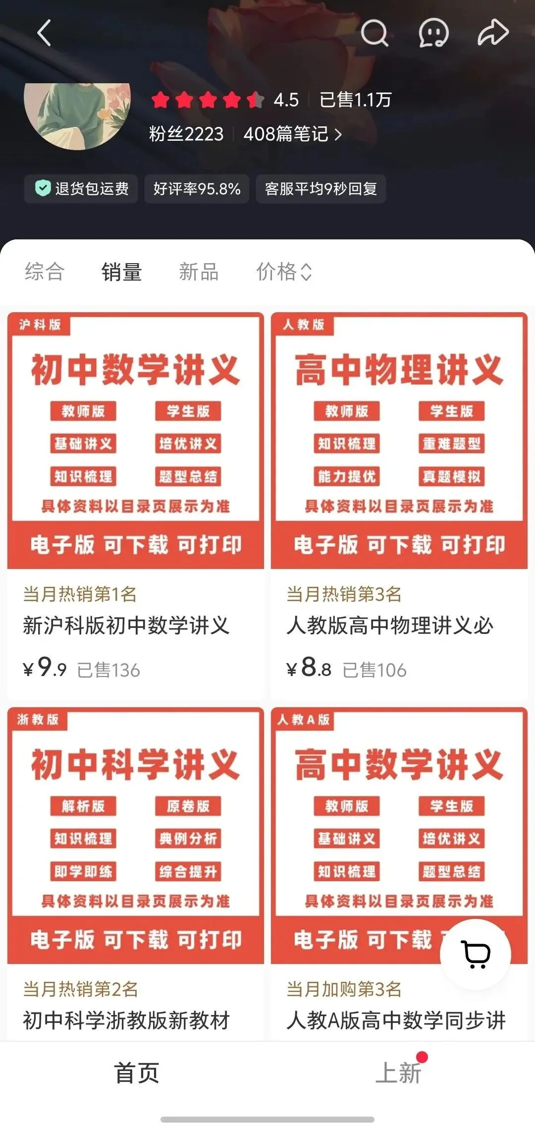 这个店铺主要销售初中讲义,平均定价9.9元,累计售出1.1万份,算下来总营业额接近11万元。