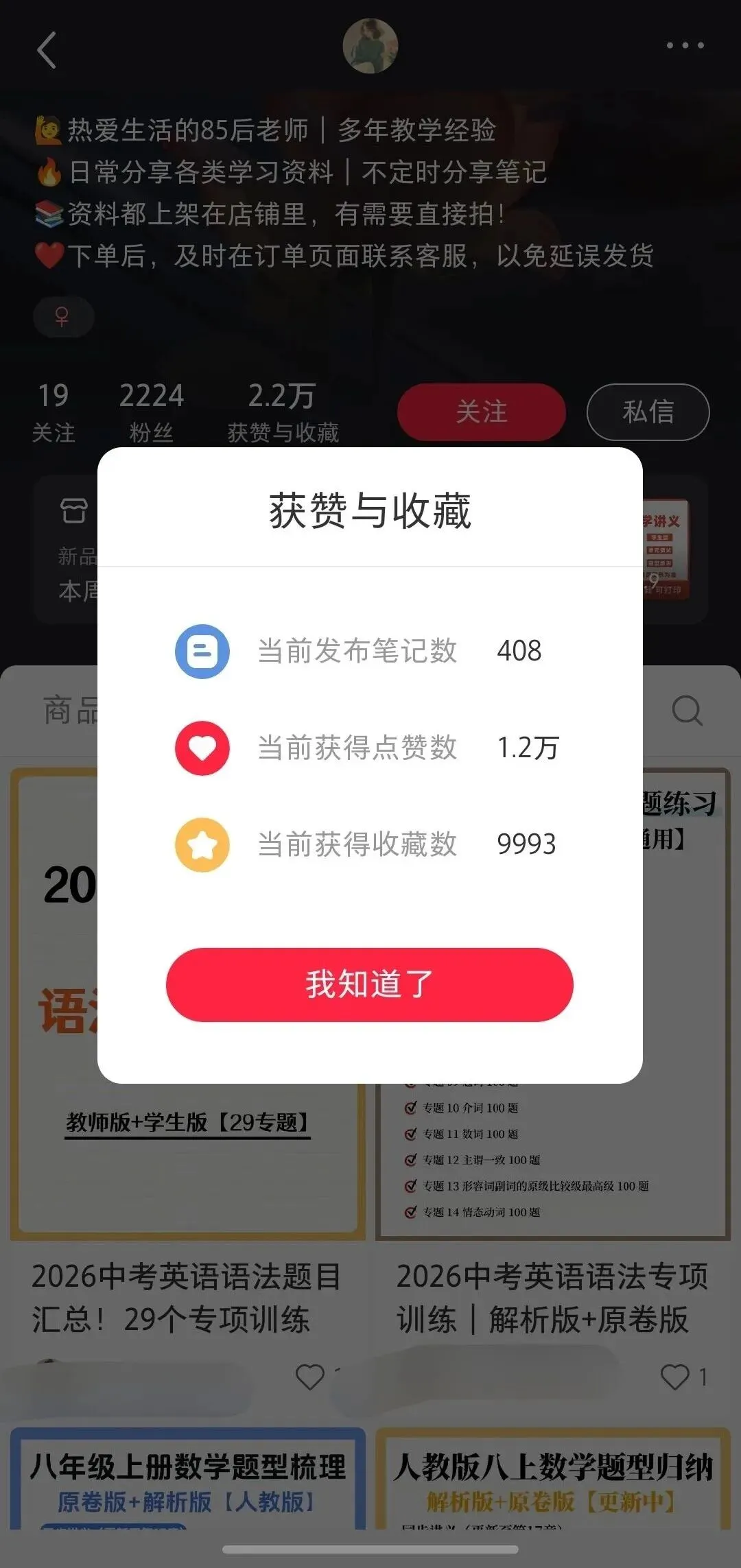 该账号至今发布了400多篇笔记,收获点赞1.2万,收藏近1万。店铺始终围绕初中讲义展开,定价9.9元,卖出1.1万份,营业额约11万元。