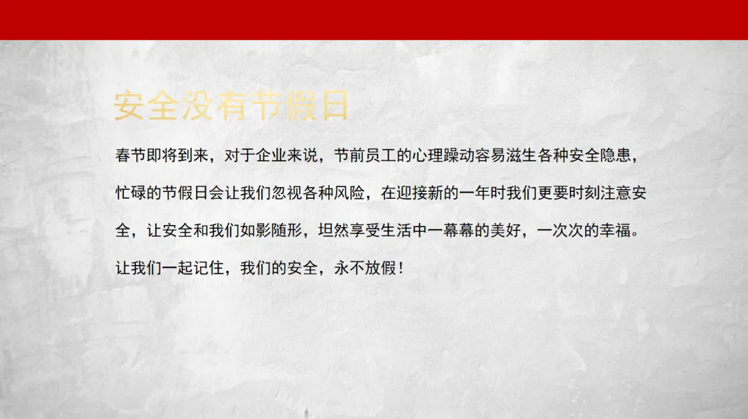 安全责任重于泰山,容不得丝毫懈怠。请各部门严格落实本次培训管控要求,扎实做好节前安全排查、节日值守管控及个人安全防护工作,全力防范各类安全事故发生。文末附上原创培训PPT及安全自查清单,可下载用于内部二次培训、自查自纠工作,携手筑牢安全防线,平安喜迎马年春节。