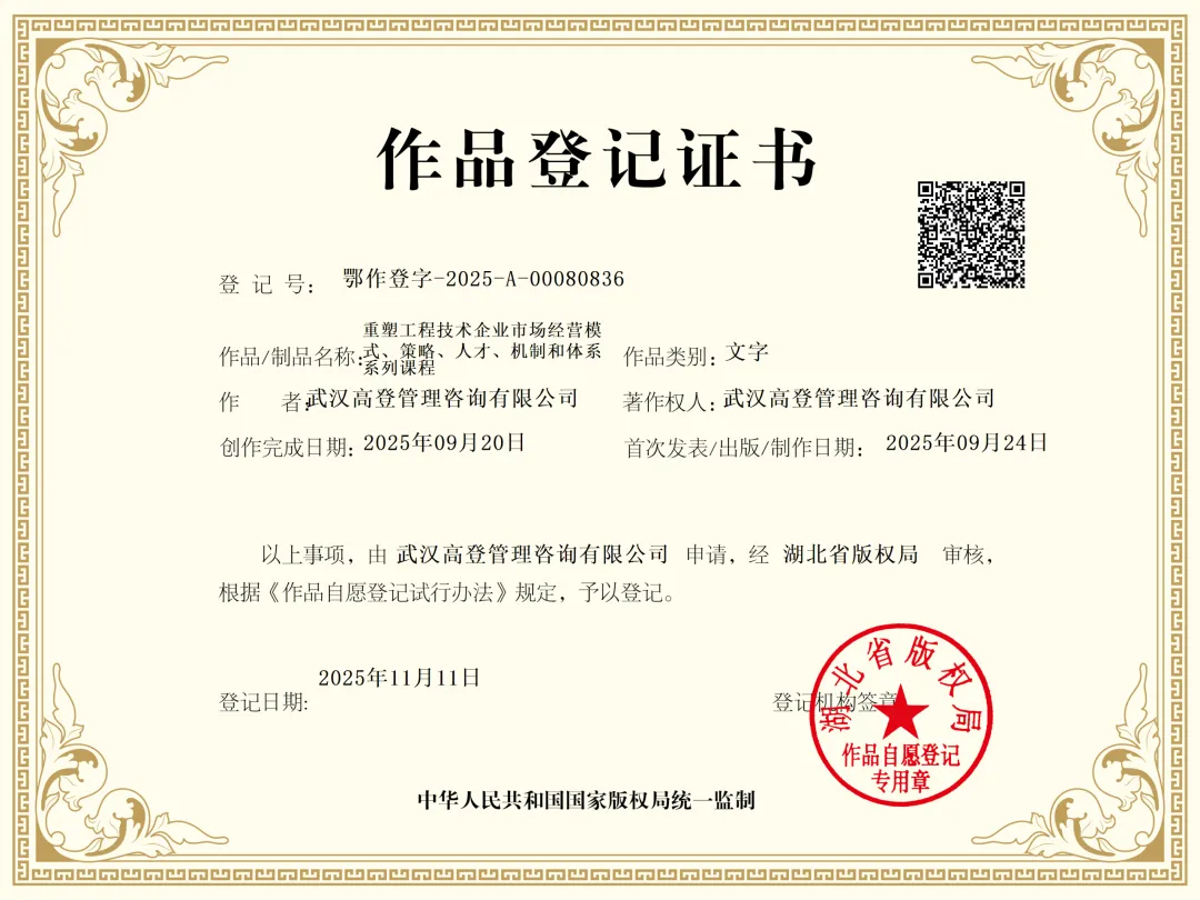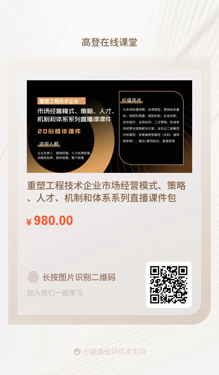 武汉高登管理咨询重磅推出《重塑工程技术企业市场经营模式、策略、人才、机制和体系系列直播课件包》,20份专业PDF课件,原价1443.9元,现特惠价仅980元,用一顿饭的成本,为企业注入“十五五”增长新动能!