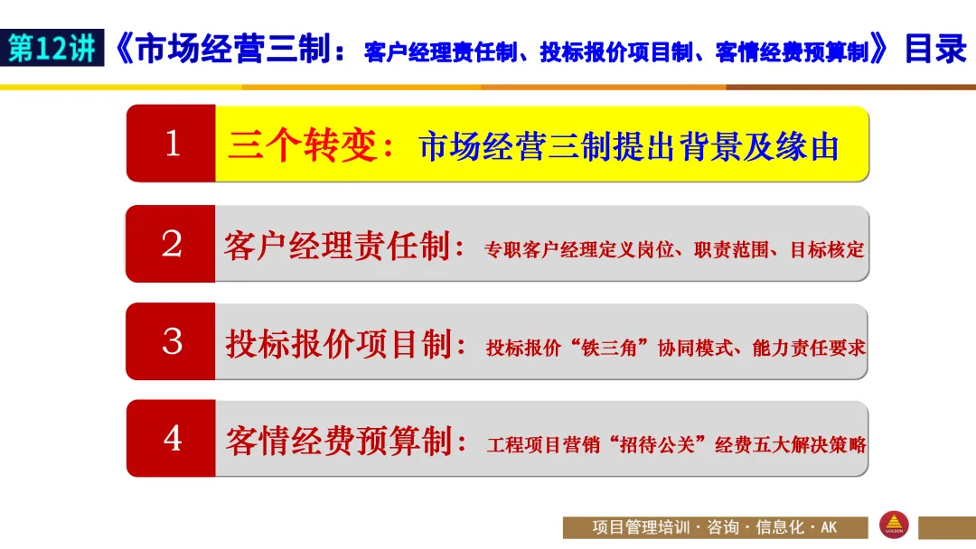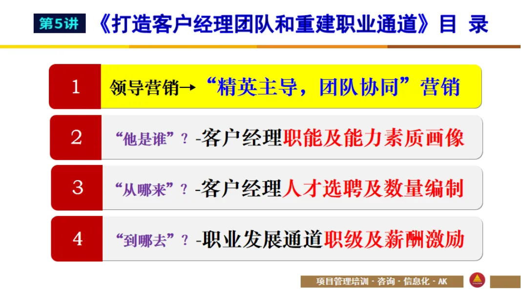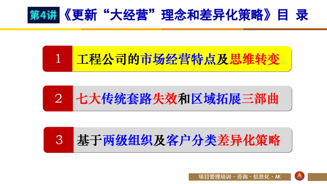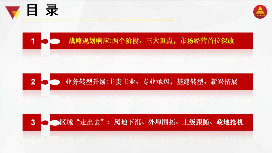 20份课件层层递进,既有宏观战略指引,又有微观实操工具:从“十四五”行业复盘与“十五五”机遇预判,到业务转型升级与区域“走出去”策略;从三位一体立体营销组织构建,到“大经营”理念与差异化策略落地;从客户经理团队打造与职业通道设计,到绩效激励“刚兑”机制建立;从水利等热门赛道突破路径,到外埠区域深耕实操方法,覆盖企业市场经营全维度。