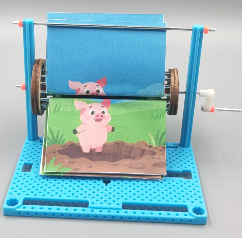 “我们的眼睛就像一台小照相机,当快速摇动手柄,卡片依次翻转,前一张画面的影像还没从视网膜上消失,后一张就出现了,大脑会自动把这些连续的静态画面‘拼起来’,让我们误以为小猪真的在动!转速越快,画面切换越频繁,动画就越流畅。”