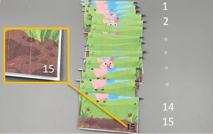“卡片处理员” 负责将 15 张带页码的图片纸贴好双面胶,对折后固定短轴,确保短轴左右露出均匀。“记录员” 检查卡片固定情况和页码顺序(1-15),教师提问引导:“为什么要按页码顺序摆放?乱了会怎么样?” (答案:页码对应连续动作,乱序会导致动画不连贯)。