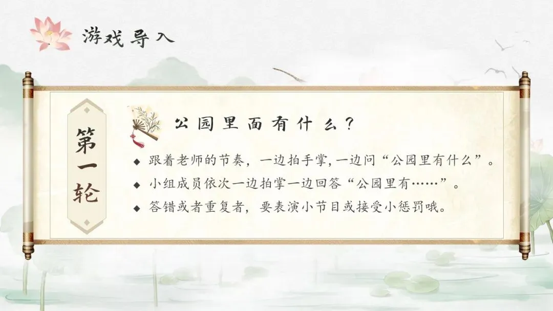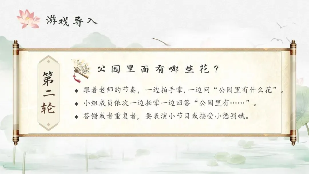 1.第一轮游戏:公园里面有什么?第二轮游戏:公园里有哪些花?