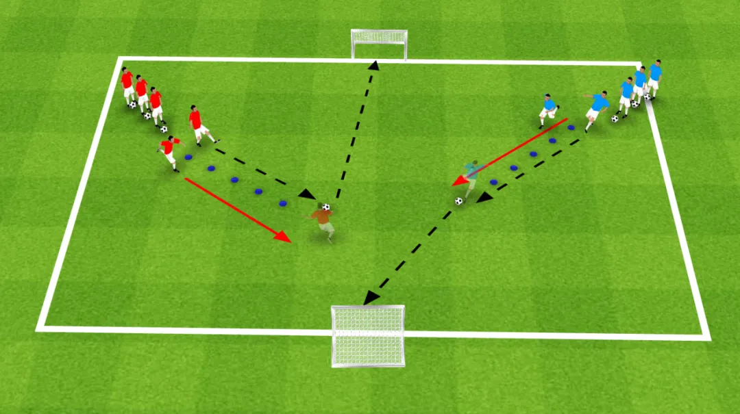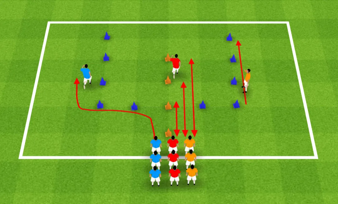 3. 完成一次训练后双方球员互相跑到对方的队尾等待下一次练习。